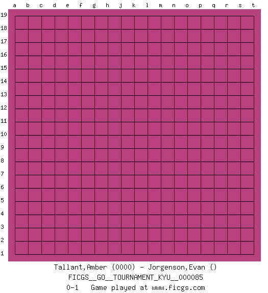 Last move : 0-1 2009 July 27 11:21:11 [Event "FICGS__GO__TOURNAMENT_KYU__000085"] [Site "FICGS"] [Date "2009.06.24"] [Round "1"] [Black "Tallant,Amber"] [White "Jorgenson,Evan"] [Result "0-1"] [Rating 1 "0000"] 0-1 This go game has been lost on time (started : 2009.06.24 18:38:28) Here are the names of the openings (joseki) played in the four corners : Player White won this Go (weiqi, baduk) game. Follow this game move after move (download)Every move brings change. (Pierre Audouard) Philosophers use a language that is already deformed as though by shoes that are too tight. (Ludwig Wittgenstein)