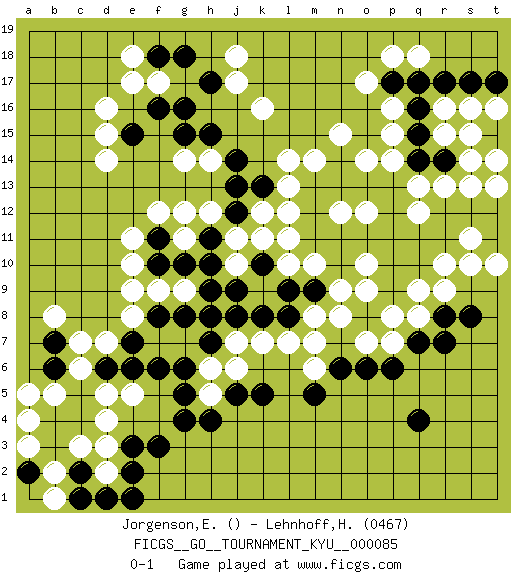 Last move : 0-1 2009 December 28 20:15:28 [Event "FICGS__GO__TOURNAMENT_KYU__000085"] [Site "FICGS"] [Date "2009.06.24"] [Round "1"] [Black "Jorgenson,Evan"] [White "Lehnhoff,Heinz-Georg"] [Result "0-1"] [Rating 2 "0467"] 1.q4 d16 2.k5 d4 3.f3 c6 4.f6 e8 5.g8 g9 6.h9 f9 7.f8 e9 8.e7 d7 9.d6 d5 10.e6 h6 11.g5 j7 12.j8 k7 13.l8 l7 14.h7 j6 15.g6 m6 16.m5 m8 17.m9 n8 18.k8 m7 19.n6 n9 20.n10 m10 21.l9 l10 22.j9 j11 23.h10 g11 24.h11 h12 25.g10 g12 26.f10 e11 27.j12 k11 28.f11 f12 29.o8 o9 30.k10 j10 31.p9 o10 32.n11 k12 33.j13 e10 34.k13 k9 35.h8 l12 36.k10 n12 37.m11 l11 38.m12 l13 39.m13 l14 40.o11 o12 41.p12 p11 42.o13 m14 43.n13 o14 44.q11 q12 45.r12 q13 46.q14 p14 47.p13 r13 48.r14 s13 49.s12 p8 50.p10 o7 51.o6 q9 52.q10 r9 53.q7 p7 54.p6 q8 55.r7 r10 56.r11 s11 57.t11 s10 58.t12 s14 59.s15 e5 60.e3 d3 61.e2 d2 62.d1 t10 63.p11 r15 64.q15 r16 65.n14 p15 66.q16 p16 67.q17 s16 68.t15 t16 69.r17 t14 70.s17 n15 71.t17 k16 72.j5 h5 73.h4 h14 74.g4 n12 75.r8 t13 76.s8 p18 77.p17 o17 78.c5 q18 79.t15 o12 80.h17 c7 81.c2 s15 82.b6 b5 83.c4 a5 84.b7 b8 85.b4 c3 86.b3 b2 87.c1 b1 88.e1 a4 89.a2 a3 90.g16 f17 91.f16 e17 92.g18 d14 93.e15 d15 94.f18 j17 95.j14 g14 96.g15 e18 97.h15 j18 0-1 This go game has been lost on time (started : 2009.06.24 18:38:28) Here are the names of the openings (joseki) played in the four corners : Corner d4 : d4 f3 Hoshi (Hwajeom, Seongjeom, Xingwei`) 4-4 Point. The star or hoshi (4-4) point, emphasizing influence at the potential expense of territory. Ikken Kakari (Hankan Keolch'im, Yi Gua`jiao~, 1-Space Low Approach). Black 2 is the standard approach move to the 4-4. Corner q16 : n11 l12 This joseki is unknown. A weak or weird move has probably been played in this corner. Player White won this Go (weiqi, baduk) game. Follow this game move after move (download)Don't overlook the edge of the board. (Anonymous) The Internet is the first thing that humanity has build that humanity doesn't understand, the largest experiment in anarchy that we have ever had. (Eric Schmidt)
