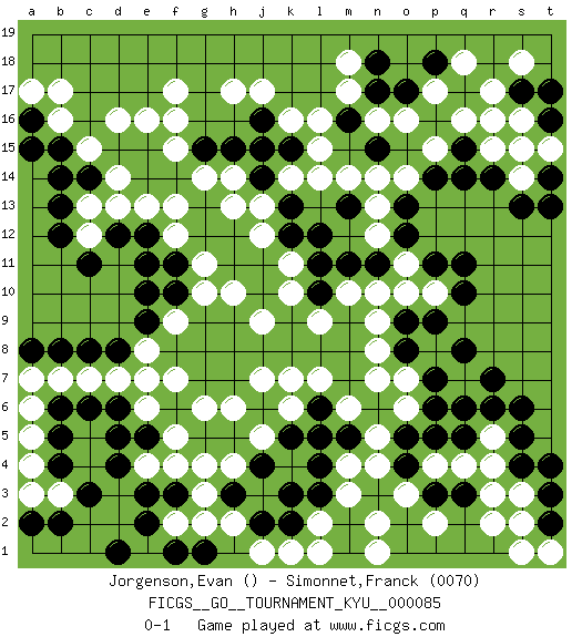 Last move : 0-1 2010 January 5 8:26:43 [Event "FICGS__GO__TOURNAMENT_KYU__000085"] [Site "FICGS"] [Date "2009.06.24"] [Round "1"] [Black "Jorgenson,Evan"] [White "Simonnet,Franck"] [Result "0-1"] [Rating 2 "0070"] 1.d4 r16 2.k5 d16 3.q10 q4 4.p5 o3 5.o4 p4 6.q5 r4 7.s4 s3 8.e10 p17 9.q14 k16 10.n15 f17 11.f14 d13 12.d12 c12 13.c11 e13 14.b12 c13 15.e12 m3 16.l4 s14 17.r14 f12 18.s13 l14 19.e11 e6 20.d6 d7 21.c6 e8 22.e9 n4 23.o5 n5 24.r7 f4 25.f3 e4 26.e3 h4 27.j4 h6 28.h3 p8 29.m2 l2 30.l3 n2 31.m1 l1 32.k2 n1 33.s5 r5 34.r6 n7 35.q8 o6 36.q6 k1 37.j2 j1 38.g1 h2 39.h1 g2 40.f1 f2 41.e2 e1 42.d1 g3 43.f1 j3 44.k3 k7 45.e5 f5 46.d5 f7 47.d8 c7 48.c8 b7 49.b8 a6 50.a8 e7 51.b5 f9 52.t3 s2 53.t2 s1 54.t4 p2 55.t14 p15 56.p14 p10 57.p11 o14 58.o13 n14 59.b13 a5 60.b4 a4 61.b2 b3 62.c3 a3 63.a2 a7 64.c14 f13 65.g13 g14 66.g15 h14 67.h15 h13 68.g12 g11 69.h12 j12 70.h11 h10 71.j11 k11 72.j10 j9 73.f11 k10 74.p9 o10 75.o9 n9 76.o8 n8 77.o12 s15 78.n11 n10 79.m11 o7 80.p7 f15 81.e14 d14 82.e15 f16 83.d15 c15 84.b14 b16 85.m5 m6 86.l6 m4 87.l5 l7 88.j6 k6 89.h5 j7 90.g5 j5 91.h3 g4 92.j6 g6 93.b6 j5 94.m13 m14 95.l12 m10 96.j16 h17 97.j14 j13 98.k13 k14 99.j15 j17 100.k15 l15 101.k12 n13 102.b15 e16 103.a16 a17 104.a15 b17 105.l11 o11 106.q11 n12 107.l10 l9 108.m16 l16 109.o17 n16 110.n17 o16 111.p18 m17 112.t13 t15 113.q3 r2 114.p3 r3 115.q15 q16 116.s17 r17 117.g1 m18 118.n18 q18 119.t16 s16 120.t17 s18 121.f10 g10 122.p6 t1 123.s6 r15 0-1 Here are the names of the openings (joseki) played in the four corners : Corner q4 : q4 p5 Hoshi (Hwajeom, Seongjeom, Xingwei`) 4-4 Point. The star or hoshi (4-4) point, emphasizing influence at the potential expense of territory. Corner d4 : d4 e6 Hoshi (Hwajeom, Seongjeom, Xingwei`) 4-4 Point. The star or hoshi (4-4) point, emphasizing influence at the potential expense of territory. Player White won this Go (weiqi, baduk) game. Follow this game move after move (download)Capture what you cut off. (Anonymous) Go and wake up your luck. (Persian saying)
