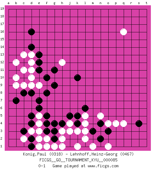 Last move : 0-1 2009 July 11 7:44:28 [Event "FICGS__GO__TOURNAMENT_KYU__000085"] [Site "FICGS"] [Date "2009.06.24"] [Round "1"] [Black "Konig,Paul"] [White "Lehnhoff,Heinz-Georg"] [Result "0-1"] [Rating 1 "0318"] [Rating 2 "0467"] 1.d4 q16 2.k10 d10 3.d16 q4 4.d8 c9 5.e11 d11 6.c12 d12 7.d14 d13 8.e12 c13 9.e13 b12 10.e7 c11 11.c8 d9 12.f8 e9 13.f10 b9 14.g9 b10 15.b7 e5 16.f5 e4 17.f4 e3 18.f3 e2 19.e6 f2 20.g2 h2 21.g3 h3 22.h4 j3 23.g4 j4 24.d2 g1 25.d5 d3 26.c3 f1 27.k2 l3 28.j2 h1 29.d1 e1 30.j5 c2 31.g11 h12 32.k4 k3 33.m3 l4 34.k5 l5 35.l6 l2 36.l1 m1 37.j1 k1 38.o3 o4 39.n4 p4 40.n2 o1 41.s4 n5 0-1 Here are the names of the openings (joseki) played in the four corners : Player White won this Go (weiqi, baduk) game. Follow this game move after move (download)Five groups might live but the six will die. (Anonymous) A shortcut is the longest distance between two points. (Don Groves)