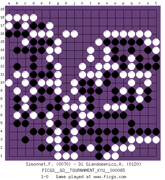 Last move : 1-0 2009 October 9 14:32:32 [Event "FICGS__GO__TOURNAMENT_KYU__000085"] [Site "FICGS"] [Date "2009.06.24"] [Round "1"] [Black "Simonnet,Franck"] [White "Di Giandomenico,Alfonso"] [Result "1-0"] [Rating 1 "0070"] [Rating 2 "0120"] 1.q4 p16 2.c16 j16 3.d4 d16 4.d17 e16 5.e17 d14 6.e6 q10 7.b14 f17 8.d15 c15 9.e15 f16 10.e14 c17 11.b16 d18 12.b17 c18 13.p13 q13 14.q14 r14 15.q15 q16 16.o15 o16 17.r15 r16 18.m14 m15 19.r13 q12 20.r12 r11 21.s14 s16 22.d13 f14 23.f15 g15 24.c14 g14 25.p12 q11 26.d14 h16 27.q8 p11 28.n11 o12 29.o13 n13 30.o14 n14 31.n15 n16 32.m13 n12 33.o11 m12 34.l12 m11 35.n10 l11 36.o9 s15 37.p15 k12 38.s9 l13 39.d10 l14 40.k4 e10 41.e9 f10 42.f12 g12 43.f11 g11 44.e11 g9 45.g8 h8 46.f9 g10 47.g7 h7 48.k9 j9 49.k10 j10 50.h6 j7 51.j6 k7 52.l7 k8 53.l8 l9 54.l10 k11 55.m9 m10 56.l9 k6 57.l5 l6 58.m6 k5 59.j5 t14 60.t13 t15 61.s12 s11 62.t12 p9 63.o8 o7 64.p8 p7 65.q7 n7 66.n6 m5 67.l4 n5 68.o6 o5 69.p6 p5 70.q5 p4 71.o3 n3 72.o4 o2 73.p3 p2 74.n4 q3 75.m4 r3 76.n2 n1 77.m2 q2 78.s4 s3 79.r4 t3 80.t4 f13 81.d12 b18 82.c6 a17 83.a16 a18 84.m1 o1 85.c3 l2 86.m3 j4 87.h4 j3 88.h3 g2 89.h2 g1 90.f2 f3 91.e2 g3 92.f4 g4 93.g5 f5 94.e4 f6 95.f7 h1 96.j2 d9 97.e8 c10 98.d11 c8 99.b10 b6 100.b7 c7 101.b8 b9 102.b5 b11 103.d8 d6 104.c5 j1 105.k2 r9 106.s8 r8 107.r7 a10 108.c9 c11 109.b12 d9 110.d7 s10 111.q9 1-0 Here are the names of the openings (joseki) played in the four corners : Corner d16 : c16 j16 Komoku (Somok, Xiao~mu`) 3-4 Point. The komoku (3-4) point is the traditional corner enclosure move.. Corner q16 : p16 p13 Takamoku (Gomok, Gaomu`) 5-4 Point. The takamoku (high) point (5-4). With its emphasis on influence, the 5-4 point complements the 4-4 (hoshi) point in creating an influence-oriented fuseki. Player Black won this Go (weiqi, baduk) game. Follow this game move after move (download)The enemy's vital point is your own. (Anonymous) If you don't practice you don't deserve to win. (Andre Agassi)