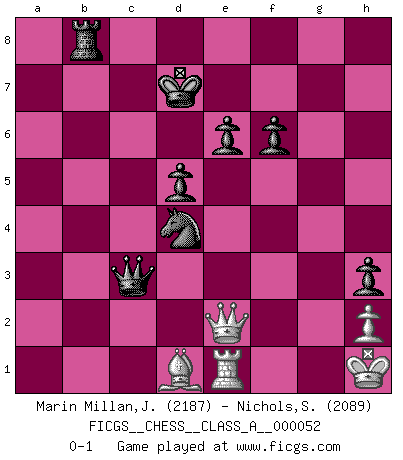 Last move : 0-1 2010 February 15 2:20:30 [Event "FICGS__CHESS__CLASS_A__000052"] [Site "FICGS"] [Date "2009.06.24"] [Round "1"] [White "Marin Millan,Jose Antonio"] [Black "Nichols,Scott"] [Result "0-1"] [WhiteElo "2187"] [BlackElo "2089"] 1.d4 Nf6 2.Nf3 d5 3.e3 c5 4.b3 cxd4 5.exd4 Nc6 6.Be2 Bf5 7.Nh4 Be4 8.f3 Bg6 9.O-O Qc7 10.c3 e6 11.Na3 Bd6 12.g3 a6 13.Bb2 Nh5 14.f4 Nxf4 15.gxf4 Bxf4 16.Nf3 Be4 17.Qe1 g5 18.Bc1 Bd6 19.Rf2 O-O-O 20.Nd2 Bf5 21.b4 Ne7 22.Nf1 Rdg8 23.b5 g4 24.Rg2 Qa5 25.bxa6 Bxa3 26.axb7+ Kxb7 27.Ng3 Bg6 28.Bxg4 h5 29.Bxa3 Qxa3 30.Bf3 h4 31.Ne2 Bf5 32.Qd2 Kc7 33.Rxg8 Rxg8+ 34.Kh1 Kd7 35.Rg1 Rb8 36.Qg5 h3 37.Qg3 Ra8 38.Qf4 Qxa2 39.Re1 Qc2 40.Kg1 Ng6 41.Qg5 Qd3 42.Qg3 Qd2 43.Qf2 Rg8 44.Ng3 Nh4 45.Be2 Qxc3 46.Rf1 Qb2 47.Re1 f6 48.Bd1 Qc3 49.Kh1 Rb8 50.Nxf5 Nxf5 51.Qe2 Nxd4 0-1 Queen's pawn game Kingside Castling by player White (move 9) Queenside Castling by player Black (move 19) Player Black won this chess game. Follow this game move after move (download)The laws of Chess do not permit a free choice: you have to move whether you like it or not. (Emanuel Lasker) Alle Schachspieler sollten auch ein Hobby haben. (Savielly Grigorievitsch Tartakower) Me siento como si fuera una pieza en una partida de Ajedrez, cuando mi oponente me indica: esa pieza no puede ser movida. (Soren Kierkegaard) Donnez-moi un Cavalier en 6e et je gagnerais toutes mes parties. (Steinitz) There is a very easy way to return from a casino with a small fortune : go there with a large one. (Jack Yelton)
