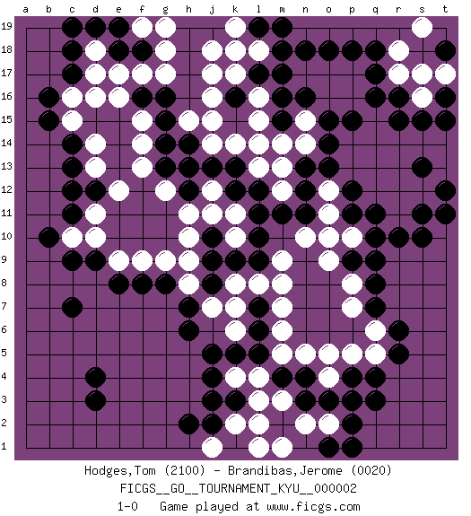 Last move : 1-0 2006 December 7 16:19:16 [Event "FICGS__GO__TOURNAMENT_KYU__000002"] [Site "FICGS"] [Date "2006.09.14"] [Round "1"] [Black "Hodges,Tom"] [White "Brandibas,Jerome"] [Result "1-0"] [Rating 1 "2100"] [Rating 2 "0020"] 1.d4 d16 2.q17 p16 3.q16 q15 4.p15 p14 5.o15 o16 6.r15 q14 7.n16 n15 8.o14 n17 9.m16 p17 10.p18 o17 11.m17 n14 12.o13 p13 13.p12 o12 14.n13 r14 15.r16 q12 16.p11 m12 17.n12 o11 18.n11 o10 19.q11 r12 20.q9 n10 21.m11 m14 22.l12 m13 23.l10 k11 24.l11 l13 25.k13 k14 26.k12 r11 27.p9 l15 28.m15 l14 29.k16 l16 30.l17 j14 31.r10 p10 32.q10 m9 33.s13 s12 34.s10 k17 35.k18 j17 36.n18 j12 37.l9 m8 38.r5 k8 39.j10 k10 40.k9 j11 41.j8 j16 42.j13 h11 43.h14 j15 44.g13 h10 45.j9 j18 46.g16 l18 47.m18 k19 48.c14 s14 49.s15 t13 50.r13 o9 51.q7 p8 52.q8 p7 53.q3 d10 54.b16 d14 55.c13 d13 56.d12 e12 57.c11 d11 58.c12 k7 59.k3 k4 60.j3 m3 61.j4 l3 62.d3 q6 63.r6 q5 64.q4 p5 65.c7 c10 66.b10 c15 67.b15 c16 68.c17 d17 69.c18 h15 70.g15 f14 71.g14 g12 72.h6 j7 73.h7 h8 74.g8 h9 75.c9 l8 76.h13 g17 77.d9 e9 78.e8 f9 79.f8 g9 80.k5 l4 81.l5 m5 82.e18 e17 83.f18 g18 84.o18 d18 85.d19 f19 86.e19 g19 87.o3 f17 88.c19 f15 89.s11 t15 90.t16 t14 91.t11 k6 92.j5 q13 93.t12 o2 94.p2 s17 95.s13 r13 96.s13 f13 97.n4 n5 98.m4 o4 99.n3 n2 100.p3 k2 101.j2 l1 102.m2 l2 103.o1 m1 104.l6 m6 105.p1 j1 106.h2 r18 107.q18 s19 108.t18 t17 109.m19 s16 110.t15 r17 111.p4 o5 112.l7 m7 113.f16 e16 114.l19 k18 115.h12 1-0 Here are the names of the openings (joseki) played in the four corners : Corner q16 : q17 p16 Komoku (Somok, Xiao~mu`) 3-4 Point. The komoku (3-4) point is the traditional corner enclosure move.. Player Black won this Go (weiqi, baduk) game. Follow this game move after move (download)Attach to the strongest stone in a pincer. (Anonymous) May I never be complete. May I never be content. May I never be perfect. Deliver me, Tyler, from being perfect and complete. (Chuck Palahniuk, Fight Club)