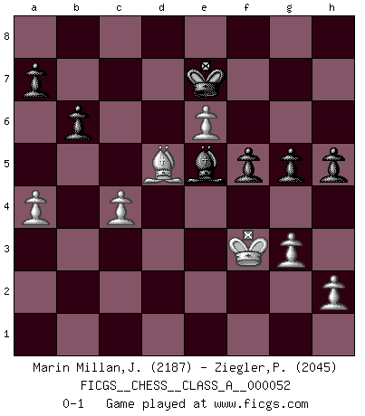 Last move : 0-1 2010 February 19 9:1:52 [Event "FICGS__CHESS__CLASS_A__000052"] [Site "FICGS"] [Date "2009.06.24"] [Round "1"] [White "Marin Millan,Jose Antonio"] [Black "Ziegler,Pio"] [Result "0-1"] [WhiteElo "2187"] [BlackElo "2045"] 1.e4 c5 2.Nf3 d6 3.d4 cxd4 4.Nxd4 Nf6 5.Nc3 g6 6.Be2 Bg7 7.O-O O-O 8.Bg5 Nc6 9.Nb3 Be6 10.Kh1 Rc8 11.Qd2 d5 12.Bxf6 Bxf6 13.Nxd5 Bxb2 14.Rad1 Bg7 15.f4 Qd6 16.Rf3 Bxd5 17.exd5 Nb8 18.c4 Nd7 19.g3 Rfd8 20.Re3 Nb6 21.Na5 Rc7 22.Qe1 Rdc8 23.Bg4 Rb8 24.Be2 Na4 25.Rb3 Nc5 26.Re3 Re8 27.Qb4 Qb6 28.a3 Qd6 29.Nb3 b6 30.Kg2 Nb7 31.Nd2 Qc5 32.Qxc5 Rxc5 33.Ne4 R5c8 34.Bf1 e5 35.fxe5 Rxe5 36.Rde1 Rce8 37.R3e2 f5 38.Ng5 Rxe2+ 39.Rxe2 Rxe2+ 40.Bxe2 Nc5 41.Ne6 Nxe6 42.dxe6 Kf8 43.Bf3 Ke7 44.Bd5 g5 45.Kf3 h5 46.a4 Be5 0-1 This chess game has been lost on time (started : 2009.06.24 22:49:14) Sicilian : Dragon variation Kingside Castling by player White (move 7) Kingside Castling by player Black (move 7) Player Black won this chess game. Follow this game move after move (download)Pawn endings are to Chess what putting is to golf. (Cecil Purdy) Sicherlich können nur Meister einen Stil haben. Daß ein nicht-Meister auch nur ein einziges Mal in seinem Leben eine Partie folgerecht durchführte, habe ich niemals bemerkt. (Emanuel Lasker) Un entendimiento a fondo de las continuaciones típicas del mate, hace de las combinaciones de sacrificio mas complicadas conducirlas a ellas no solo sin dificultad, sino casi de una manera natural. (Siegbert Tarrasch) Je ne crois pas en la psychologie, je crois aux bons coups. (Robert Fischer) What doesn't kill us makes us stronger. (Friedrich Nietzsche)