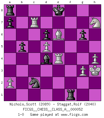 Last move : 1-0 2009 November 11 19:49:20 [Event "FICGS__CHESS__CLASS_A__000052"] [Site "FICGS"] [Date "2009.06.24"] [Round "1"] [White "Nichols,Scott"] [Black "Staggat,Rolf"] [Result "1-0"] [WhiteElo "2089"] [BlackElo "2040"] 1.e4 e5 2.d4 exd4 3.c3 dxc3 4.Nxc3 Nc6 5.Nf3 Bc5 6.Bc4 d6 7.Bg5 Nge7 8.Nd5 h6 9.Bh4 O-O 10.O-O Be6 11.b4 Bxd5 12.exd5 Nxb4 13.Re1 g5 14.Bxg5 hxg5 15.Nxg5 Qd7 16.Qh5 Qf5 17.Rxe7 b5 18.Be2 Bxf2+ 19.Kh1 Qg6 20.Qxg6+ fxg6 21.Bg4 Rf4 22.Be6+ Kf8 23.Rd7 Be3 24.g3 Rf2 25.Nh7+ Ke8 26.Re1 Bd4 27.Re4 Nc2 28.h4 Rf1+ 29.Kg2 Rf2+ 30.Kh3 Rf1 31.Rxc7 1-0 Danish gambit Kingside Castling by player Black (move 9) Kingside Castling by player White (move 10) Player White won this chess game. Follow this game move after move (download)Pawns are born free, yet they are everywhere in chains. (Rick Kennedy) Das typische an einem Großmeister ist, daß er eine gewonnene Position schnell und schmerzlos gewinnt. (Irving Chernev) Los Peones son nacidos libres, y aún así, se encuentran encadenados por todos lados. (Rick Kennedy) Nous sommes les pions de la mystérieuse partie d'Echecs jouée par Dieu. Il nous déplace, nous arrête, nous pousse encore, puis nous lance un à un dans la boîte du Néant. Epitaphe sur la tombe de David Janowsky (1868-1927). Computers have lots of memory but no imagination. (Anonymous)