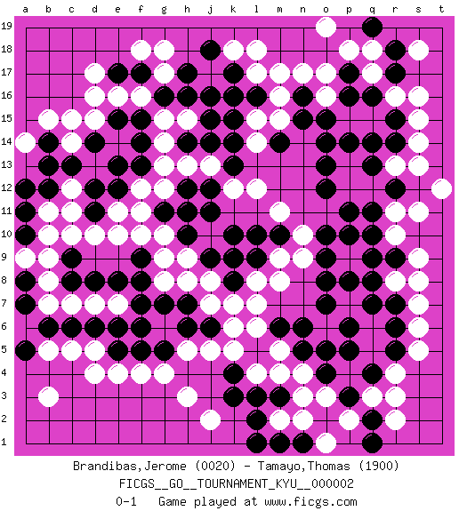 Last move : 0-1 2006 October 13 16:33:33 [Event "FICGS__GO__TOURNAMENT_KYU__000002"] [Site "FICGS"] [Date "2006.09.14"] [Round "1"] [Black "Brandibas,Jerome"] [White "Tamayo,Thomas"] [Result "0-1"] [Rating 1 "0020"] [Rating 2 "1900"] 1.q4 d4 2.q16 d17 3.k10 r10 4.q11 r11 5.q10 q9 6.r12 q12 7.q13 p12 8.p10 p9 9.o10 r13 10.s12 s13 11.o12 p13 12.q14 r8 13.o14 c15 14.p14 s11 15.o13 t12 16.p11 o3 17.r12 k16 18.k14 h15 19.h14 g14 20.j15 h13 21.j14 g15 22.j16 q17 23.p17 p18 24.r17 q18 25.r18 o17 26.p16 m17 27.n16 n17 28.k17 l18 29.l16 l4 30.o4 n4 31.n5 n3 32.p5 o6 33.o5 m5 34.n6 d10 35.f17 g12 36.e15 f16 37.f15 e16 38.d14 c12 39.o8 g17 40.f13 g13 41.f14 f12 42.e12 e11 43.d12 c11 44.c13 c14 45.b13 d15 46.e13 b10 47.d11 e10 48.b14 b15 49.b12 b11 50.a11 f4 51.e5 e4 52.a10 b9 53.h16 g8 54.g11 h11 55.g16 g18 56.e17 d16 57.j12 h9 58.j11 j8 59.h10 g10 60.h12 f11 61.h11 s5 62.h7 j7 63.g7 h5 64.f8 g9 65.f6 d7 66.d8 e7 67.e8 c7 68.c8 b8 69.f7 r3 70.b6 c5 71.c6 d5 72.d6 b7 73.e6 b5 74.a7 j5 75.j9 h8 76.j6 k6 77.h6 l7 78.p3 r4 79.q7 s16 80.g5 g4 81.f5 r16 82.q19 o19 83.k8 l8 84.m6 l6 85.o7 k18 86.j18 l17 87.k15 s18 88.k4 k5 89.k3 h3 90.l3 m2 91.f9 f10 92.k9 k7 93.c9 c10 94.m3 m4 95.l2 n2 96.m1 p2 97.n1 o1 98.l1 j2 99.q2 q3 100.a5 b3 101.a8 a9 102.a12 a14 103.h17 f18 104.r14 s14 105.q1 r2 106.r15 s15 107.r7 s7 108.q8 s8 109.r6 s6 110.r5 n9 111.o9 m9 112.l9 m8 113.p8 m11 114.r9 s9 115.q9 l12 116.m10 n10 117.l10 j13 118.k13 k12 119.p6 o16 120.o15 m16 121.n15 m15 122.m14 l15 123.k16 l14 0-1 Here are the names of the openings (joseki) played in the four corners : Corner q4 : q4 q9 Hoshi (Hwajeom, Seongjeom, Xingwei`) 4-4 Point. The star or hoshi (4-4) point, emphasizing influence at the potential expense of territory. Player White won this Go (weiqi, baduk) game. Follow this game move after move (download)When your opponent is thick, you must also become thick. (Otake Hideo, 9p) The difference between stupidity and genius is that genius has its limits. (Murphy)