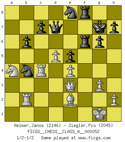 Last move : 1/2-1/2 2009 September 14 18:38:5 [Event "FICGS__CHESS__CLASS_A__000052"] [Site "FICGS"] [Date "2009.06.24"] [Round "1"] [White "Helmer,Janos"] [Black "Ziegler,Pio"] [Result "1/2-1/2"] [WhiteElo "2146"] [BlackElo "2045"] 1.d4 Nf6 2.c4 g6 3.Nc3 Bg7 4.e4 d6 5.Nf3 O-O 6.Be2 Na6 7.O-O e5 8.Be3 Ng4 9.Bg5 Qe8 10.d5 f5 11.Nd2 Bf6 12.Bxf6 Nxf6 13.exf5 Bxf5 14.f3 Qe7 15.a3 Nc5 16.b4 Na6 17.Nde4 Bxe4 18.fxe4 Kg7 19.Qd2 Nb8 20.Qe3 a5 21.c5 Na6 22.cxd6 Qxd6 23.Rac1 axb4 24.Nb5 Qe7 25.axb4 Rf7 26.Rc4 Raf8 27.Rb1 Ne8 28.R4c1 Rf4 29.g3 R4f6 30.Nc3 Nxb4 31.Na4 b6 32.Rb2 Qd6 33.Rc4 Qd7 1/2-1/2 King's Indian : Kazakh variation Kingside Castling by player Black (move 5) Kingside Castling by player White (move 7) This chess game ended in a draw. Follow this game move after move (download)Adequate compensation for a sacrifice is having a sound combination leading to a winning position; adequate compensation for a blunder is having your opponent snatch defeat from the jaws of victory. (Bruce A. Moon) Über die Verhaftung Bobby Fischers: Warum es die Bush-Administration für nötig befindet einen 61 Jahre alten Mann zu hetzten, der für niemanden ausser sich selbste eine Gefahr darstellt ist ein Rätsel. (Nigel Short) El Ajedrez es en su esencia, un juego. En su forma, un arte. Y en su ejecución, una ciencia. (Baron Tassilo) Le jeu d'échecs est comme rejeté hors du temps. (Antoine de Saint-Exupéry) The good fighters of old first put themselves beyond the possibility of defeat, and then waited for an opportunity of defeating the enemy. (Sun Tzu)