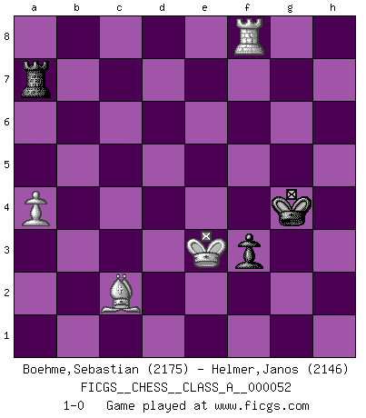 Last move : 1-0 2010 September 30 19:49:15 [Event "FICGS__CHESS__CLASS_A__000052"] [Site "FICGS"] [Date "2009.06.24"] [Round "1"] [White "Boehme,Sebastian"] [Black "Helmer,Janos"] [Result "1-0"] [WhiteElo "2175"] [BlackElo "2146"] 1.e4 c5 2.Nf3 Nc6 3.d4 cxd4 4.Nxd4 Nf6 5.Nc3 d6 6.Bg5 e6 7.Qd2 a6 8.O-O-O Bd7 9.f4 b5 10.Bxf6 gxf6 11.Kb1 Qb6 12.Nxc6 Bxc6 13.Qe1 Be7 14.f5 Qc5 15.Qh4 Qe5 16.Bd3 b4 17.Ne2 a5 18.Bc4 Qxe4 19.Qxe4 Bxe4 20.fxe6 fxe6 21.Bxe6 Bxg2 22.Rhe1 Bf3 23.Rd3 Bxe2 24.Rxe2 Ra7 25.c3 bxc3 26.Rxc3 Bd8 27.Rc6 Bc7 28.Rg2 Ke7 29.Bd5 Re8 30.Rg7+ Kd8 31.Rxh7 a4 32.h4 Re5 33.Bf3 Re7 34.Rh6 f5 35.h5 Ra5 36.Rc1 d5 37.Rf6 d4 38.h6 Bf4 39.Rd1 Be3 40.Rf8+ Kd7 41.Rh8 Ra6 42.h7 Rh6 43.Rh1 Ke6 44.Rxh6+ Bxh6 45.Be2 Ke5 46.Bd3 Rc7 47.a3 Rc1+ 48.Ka2 Bg7 49.Re8+ Kf4 50.h8Q Bxh8 51.Rxh8 Rc5 52.Rf8 Re5 53.b4 axb3+ 54.Kxb3 Kg4 55.a4 f4 56.Kc4 Ra5 57.Bc2 Ra7 58.Kxd4 f3 59.Ke3 1-0 Sicilian defense Queenside Castling by player White (move 8) Promotion Queen by player White (move 50) 10 pieces endgame at move 51 : White KRBPP , Black KRPPP WHITE : King + 1 Rook 1 Bishop 2 Pawns BLACK : King + 1 Rook 3 Pawns 9 pieces endgame at move 53 : White KRBP , Black KRPPP WHITE : King + 1 Rook 1 Bishop 1 Pawn BLACK : King + 1 Rook 3 Pawns 8 pieces endgame at move 54 : White KRBP , Black KRPP WHITE : King + 1 Rook 1 Bishop 1 Pawn BLACK : King + 1 Rook 2 Pawns 7 pieces endgame at move 58 : White KRBP , Black KRP WHITE : King + 1 Rook 1 Bishop 1 Pawn BLACK : King + 1 Rook 1 Pawn Player White won this chess game. Follow this game move after move (download)Weak points or holes in the opponent's position must be occupied by pieces not Pawns. (Siegbert Tarrasch) Gewinnen beim Schach fördert das Selbstvertrauen. Beim Sex spüre ich sowas nicht... (Garry Kasparov) Un jugador que trata de regresar una movida en el Ajedrez es un futuro carterista. (Richard Fenton) On peut tirer plus d'utilité d'une partie perdue que de 100 parties gagnées. (Capablanca) Creativity is inventing, experimenting, growing, taking risks, breaking rules, making mistakes, and having fun. (Mary Lou Cook)