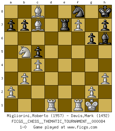 Last move : 1-0 2009 August 18 20:29:9 [Event "FICGS__CHESS__THEMATIC_TOURNAMENT__000084"] [Site "FICGS"] [Date "2009.06.26"] [Round "1"] [White "Migliorini,Roberto"] [Black "Davis,Mark"] [Result "1-0"] [WhiteElo "1957"] [BlackElo "1492"] 1.f4 d6 2.c4 Nf6 3.Nc3 g6 4.Nf3 Bg7 5.e4 Nc6 6.d4 O-O 7.Be2 Bg4 8.d5 Nb8 9.O-O c6 10.Be3 Re8 11.h3 Bxf3 12.Bxf3 Nbd7 13.Rc1 c5 14.Bf2 Rb8 15.Qe2 Nb6 16.e5 dxe5 17.fxe5 Nfd7 18.e6 fxe6 19.Qxe6+ Kh8 20.Bg3 Rc8 21.b3 Nf8 22.Qf7 Rc7 23.Bxc7 Qd7 24.Nb5 Nc8 25.Bg4 e6 26.dxe6 Qxf7 27.exf7 Re7 28.Bxc8 Bh6 29.Rcd1 1-0 Bird's Opening Kingside Castling by player Black (move 6) Kingside Castling by player White (move 9) Player White won this chess game. Follow this game move after move (download)Examine moves that smite! A good eye for smites is far more important than a knowledge of strategical principles. (Purdy) Privat ist Kortschnoi kein schlechter Mensch, sehr sympathisch. Aber während des Spiels ist er grausam. Er will dich töten. (Miguel Najdorf) El tablero es el mundo, las piezas es el fenomeno del universo, las reglas del juego son lo que llamamos leyes de la naturaleza y el jugador del lado opuesto, se encuentra oculto a nuestra vista. (Thomas Huxley) La tactique, c'est ce que vous faites quand il y a quelque chose à faire; la stratégie, c'est ce que vous faites quand il n'y a rien à faire. (Savielli Tartacower) Every now and then a man's mind is stretched by a new idea and never shrinks back to its former dimensions. (Oliver Wendell Holmes, Sr.)