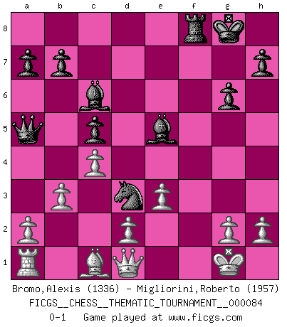Last move : 0-1 2009 July 20 18:28:11 [Event "FICGS__CHESS__THEMATIC_TOURNAMENT__000084"] [Site "FICGS"] [Date "2009.06.26"] [Round "1"] [White "Bromo,Alexis"] [Black "Migliorini,Roberto"] [Result "0-1"] [WhiteElo "1336"] [BlackElo "1957"] 1.f4 d6 2.c4 Nf6 3.Nc3 g6 4.Nf3 Bg7 5.e3 O-O 6.Bd3 c5 7.b3 e5 8.fxe5 dxe5 9.Qc2 Nc6 10.O-O Nb4 11.Qb1 Nxd3 12.Ba3 Bf5 13.Qd1 Qa5 14.Bc1 Ne4 15.Nxe4 Bxe4 16.Ng5 Bc6 17.Rxf7 Rxf7 18.Nxf7 Rf8 19.Nxe5 Bxe5 0-1 Bird's Opening Kingside Castling by player Black (move 5) Kingside Castling by player White (move 10) Player Black won this chess game. Follow this game move after move (download)You may learn much more from a game you lose than from a game you win. You will have to lose hundreds of games before becoming a good player. (Jose Raul Capablanca) Der Bart als Geschlechtszeichen mitten im Gesicht ist obszön. Daher gefällt er den Weibern. [Zugegeben, kein Schachzitat, aber unglaublich originell] (Arthur Schopenhauer) Vive, pierde y aprende al observar a tu oponente como ganar. (Amber Steenbock) On n'a jamais que l'âge auquel on a commence à jouer aux échecs car après on cesse de vieillir. (Capablanca) This is where the fun begins. (Anakin Skywalker in Star Wars ep.3)