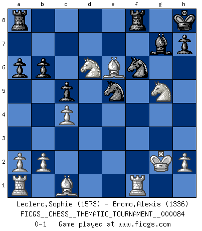 Last move : 0-1 2009 October 9 20:42:20 [Event "FICGS__CHESS__THEMATIC_TOURNAMENT__000084"] [Site "FICGS"] [Date "2009.06.26"] [Round "1"] [White "Leclerc,Sophie"] [Black "Bromo,Alexis"] [Result "0-1"] [WhiteElo "1573"] [BlackElo "1336"] 1.f4 d6 2.c4 Nf6 3.Nc3 g6 4.Nf3 Bg7 5.d4 b6 6.e4 O-O 7.Bd3 Bb7 8.O-O c5 9.d5 e6 10.dxe6 fxe6 11.Ng5 Qd7 12.f5 exf5 13.exf5 gxf5 14.Bxf5 Qc6 15.Be6+ Kh8 16.Qc2 Qxg2+ 17.Qxg2 Bxg2 18.Kxg2 Nbd7 19.Nb5 a6 20.Nxd6 Ne5 0-1 Bird's Opening Kingside Castling by player Black (move 6) Kingside Castling by player White (move 8) Player Black won this chess game. Follow this game move after move (download)Many Chess players were surprised when after the game, Fischer quietly explained: 'I had already analyzed this possibility' in a position which I thought was not possible to foresee from the opening. (Mikhail Tal) Der vorletzte Fehler gewinnt. (Savielly Grigorievitsch Tartakower) Yo tuve un dolor de muelas en la primer partida. En el segundo juego, tuve un dolor de cabeza. En el tercero, tuve un ataque de reumatísmo. En la cuarta partida, no me sentía muy bien. ¿Y en el quinto juego? Bueno, ¿que acaso uno tiene que ganar todos los juegos?. (Siegbert Tarrasch) On a dit que l'homme se distingue de l'animal par le fait qu'il achète plus de livres qu'il ne peut en lire. Je voudrais suggérer qu'inclure à la liste des livres quelques livres d'échecs rendrait la distinction manifeste. (Edward Lasker) Indecision is the key to flexibility. (Unknown)