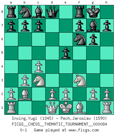 Last move : 0-1 2009 September 17 10:20:6 [Event "FICGS__CHESS__THEMATIC_TOURNAMENT__000084"] [Site "FICGS"] [Date "2009.06.26"] [Round "1"] [White "Inving,Yugi"] [Black "Pech,Jaroslav"] [Result "0-1"] [WhiteElo "1345"] [BlackElo "1590"] 1.f4 d6 2.c4 Nf6 3.Nc3 g6 4.Nf3 Bg7 5.b3 O-O 6.Bb2 e5 7.fxe5 dxe5 0-1 This chess game has been lost on time (started : 2009.06.26 12:58:57) Bird's Opening Kingside Castling by player Black (move 5) Player Black won this chess game. Follow this game move after move (download)Look at Garry Kasparov. After he loses, invariably he wins the next game. He just kills the next guy. That's something that we have to learn to be able to do. (Maurice Ashley) Drei Punkte vor allen anderen ist wie einer, der im weißen Anzug posiert, während der Rest in Müllsäcke gekleidet dasteht. (Viktor Kortschnoi) Siempre es mejor sacrificar los hombres de tu oponente. (Savielly Tartakower) Il n'y a pas eu de défaite parce que je ne crois pas que cet ordinateur ait jamais existé. IBM a triché en refusant d'imprimer les modes de recherche de la machine. C'est évident, pendant le match, des coups décisifs ont été joués par des êtres humains. Aujourd'hui, les meilleurs spécialistes en informatique ne peuvent toujours pas expliquer comment Deep-Blue a pu jouer contre la logique des ordinateurs. IBM a gagné une guerre de communication, mais ils sont incapables de prouver que l'ordinateur a gagné tout seul. (Garry Kasparov) Bobby never cared about money, though. His only desire was to prove that his choices were correct: He wanted chess to be important because he was a chess player, and he wanted to be important. Bobby knew money was important, but he didn't have a clue why, outside of clothes and status. The only way he could accomplish what he wanted was to fight for a lot of money. Once he got it, he gave it away. He did not know how to spend it. And once he'd become champion, after, essentially, sacrificing his life for it, he didn't know how to spend his time. (Bob Wade)