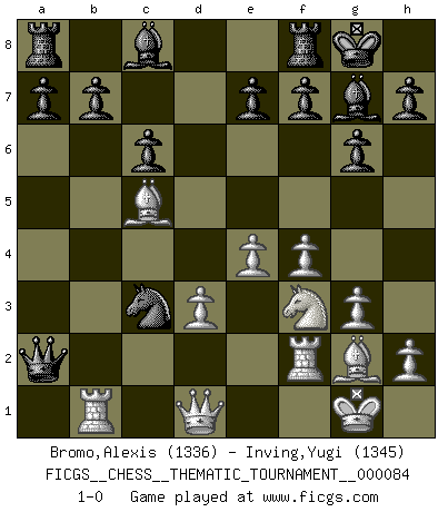 Last move : 1-0 2009 September 24 21:52:36 [Event "FICGS__CHESS__THEMATIC_TOURNAMENT__000084"] [Site "FICGS"] [Date "2009.06.26"] [Round "1"] [White "Bromo,Alexis"] [Black "Inving,Yugi"] [Result "1-0"] [WhiteElo "1336"] [BlackElo "1345"] 1.f4 d6 2.c4 Nf6 3.Nc3 g6 4.Nf3 Bg7 5.d3 O-O 6.Be3 Nc6 7.g3 d5 8.cxd5 Nxd5 9.Nxd5 Qxd5 10.Bg2 Bxb2 11.Rb1 Qxa2 12.O-O Bg7 13.Ng5 Nd4 14.Rf2 c6 15.Nf3 Nb5 16.Bc5 Nc3 17.e4 1-0 This chess game has been lost on time (started : 2009.06.26 12:58:57) Bird's Opening Kingside Castling by player Black (move 5) Kingside Castling by player White (move 12) Player White won this chess game. Follow this game move after move (download)Bobby Fischer's current state of mind is indeed a tragedy. One of the world's greatest Chess players - the pride and sorrow of American Chess. (Frank Brady) Ein unbeabsichtigtes Patt ist der Gipfel der Dummheit. (Anonymous) Nunca nadie ha ganado una partida de Ajedrez rindiendose. (Unknown) Mon pion favori sur ma case favorite ! Bronstein en parlant d'un coup de pion en h5 quand il avait les Noirs. Art is the only way to run away without leaving home. (Twyla Tharp)