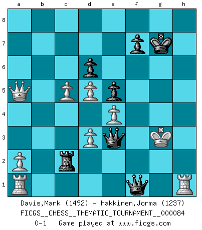 Last move : 0-1 2009 November 13 5:56:54 [Event "FICGS__CHESS__THEMATIC_TOURNAMENT__000084"] [Site "FICGS"] [Date "2009.06.26"] [Round "1"] [White "Davis,Mark"] [Black "Hakkinen,Jorma"] [Result "0-1"] [WhiteElo "1492"] [BlackElo "1237"] 1.f4 d6 2.c4 Nf6 3.Nc3 g6 4.Nf3 Bg7 5.e4 O-O 6.Be2 Bg4 7.O-O Nbd7 8.d3 Re8 9.b3 e5 10.f5 gxf5 11.Bg5 f4 12.Nh4 Bxe2 13.Qxe2 c5 14.Nf5 Nf8 15.Nxg7 Kxg7 16.Nd5 N8d7 17.Qf3 h6 18.Qh3 hxg5 19.Qf5 Nxd5 20.cxd5 Qf6 21.Qxd7 Rh8 22.Qxb7 a5 23.Qb5 Rh5 24.Kf2 Rxh2 25.Rh1 Rah8 26.Rhg1 g4 27.Ke1 Rh1 28.Kd2 R8h2 29.Rxh1 Rxg2+ 30.Ke1 f3 31.Kf1 g3 32.Qxa5 Rc2 33.b4 g2+ 34.Kg1 f2+ 35.Kxg2 Qg5+ 36.Kf1 Qe3 37.bxc5 Qe2+ 38.Kg2 f1Q+ 39.Kg3 Qe3+ 0-1 Bird's Opening Kingside Castling by player Black (move 5) Kingside Castling by player White (move 7) Promotion Queen by player Black (move 38) Player Black won this chess game. Follow this game move after move (download)Chess is a part of culture and if a culture is declining then Chess too will decline. (Mikhail Botvinnik) Das Schachspiel hat wie die Liebe, die Musik, die Fähigkeit, den Menschen glücklich zu machen. Ich habe ein leises Gefühl des Bedauerns für jeden, der das Schachspiel nicht kennt, so wie ich jeden bedaure, der die Liebe nicht kennt. (Siegbert Tarrasch) Ser exitoso en el Ajedrez te permite descubrir tu propia personalidad. Eso es lo que deseo para los niños de mi clase. (Saudin Robovic) Tous ces prétendus hommes politiques sont les pions, les Cavaliers, les Tours ou les Fous d'une partie d'échecs qui se jouera tant qu'un hasard ne renversera pas l'échiquier. (Honoré de Balzac) It is not true that people stop pursuing dreams because they grow old, they grow old because they stop pursuing dreams. (Gabriel Garcia Marquez)