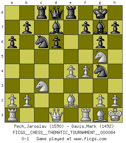 Last move : 0-1 2009 November 5 20:17:10 [Event "FICGS__CHESS__THEMATIC_TOURNAMENT__000084"] [Site "FICGS"] [Date "2009.06.26"] [Round "1"] [White "Pech,Jaroslav"] [Black "Davis,Mark"] [Result "0-1"] [WhiteElo "1590"] [BlackElo "1492"] 1.f4 d6 2.c4 Nf6 3.Nc3 g6 4.Nf3 Bg7 5.d4 O-O 6.e4 e6 7.Be2 Nc6 8.d5 exd5 9.cxd5 Ne7 10.Qb3 c6 11.dxc6 Nxc6 12.O-O Rb8 13.Kh1 Be6 14.Qd1 a6 15.Be3 Re8 16.Bf2 Ng4 17.Bg1 Rc8 18.Ng5 Bd7 0-1 This chess game has been lost on time (started : 2009.06.26 12:58:57) Bird's Opening Kingside Castling by player Black (move 5) Kingside Castling by player White (move 12) Player Black won this chess game. Follow this game move after move (download)Let the perfectionist play postal. (Yasser Seirawan) Es gibt zwei Arten von Opfern: Korrekte und meine. (Mikhail Nekhemyevich Tal) Yo jugué Ajedrez con el y a veces le pude haber ganado solo que siempre devuelve su última jugada y juega la partida de manera diferente. (Mark Twain) Une platitude souvent récitée à propos des Echecs est qu'une des choses les plus difficiles à réaliser est de gagner une position gagnante. Cela ne manque pas de sens mais, pour ma part, j'ai toujours trouvé plus difficile de gagner une position perdante. (Tim Krabbe) For a mechanic, you seem to do an excessive amount of thinking. (C-3PO in Star Wars ep.2)