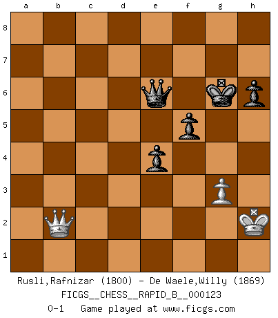 Last move : 0-1 2009 September 25 3:35:42 [Event "FICGS__CHESS__RAPID_B__000123"] [Site "FICGS"] [Date "2009.06.27"] [Round "1"] [White "Rusli,Rafnizar"] [Black "De Waele,Willy"] [Result "0-1"] [WhiteElo "1800"] [BlackElo "1869"] 1.d4 d5 2.c4 c6 3.Nc3 Nf6 4.Nf3 e6 5.e3 Nbd7 6.Qc2 Bd6 7.Bd3 O-O 8.O-O dxc4 9.Bxc4 a6 10.Bd2 c5 11.a4 b6 12.Ng5 Bxh2+ 13.Kxh2 Ng4+ 14.Kg1 Qxg5 15.Be2 Bb7 16.e4 Qh4 17.Bxg4 cxd4 18.f3 dxc3 19.Bxc3 Rac8 20.Bh3 a5 21.Qb3 Rc6 22.Bd4 Rfc8 23.Rfd1 Qe7 24.Rd2 Rc1+ 25.Rxc1 Rxc1+ 26.Kh2 h6 27.Be3 Rc8 28.g3 Ne5 29.Bxb6 Bc6 30.Bxa5 Qc5 31.Bb6 Bxa4 32.Qxa4 Qxb6 33.Bg2 Kh7 34.Qd1 Nc4 35.Re2 Rc5 36.f4 Nxb2 37.Qd7 Rh5+ 38.Bh3 Qb5 39.Qd2 Nc4 40.Qd3 Nd6 41.Qd2 Nxe4 42.Rxe4 Qf5 43.Qg2 Rxh3+ 44.Qxh3 Qxe4 45.Qf1 g5 46.fxg5 Qf5 47.g6+ Kxg6 48.Qg2 e5 49.Qc6+ Qe6 50.Qc2+ e4 51.Qb2 f5 0-1 QGD Slav defense Kingside Castling by player Black (move 7) Kingside Castling by player White (move 8) 10 pieces endgame at move 44 : White KQPP , Black KQPPPP WHITE : King + 1 Queen 2 Pawns BLACK : King + 1 Queen 4 Pawns 9 pieces endgame at move 46 : White KQPP , Black KQPPP WHITE : King + 1 Queen 2 Pawns BLACK : King + 1 Queen 3 Pawns 8 pieces endgame at move 47 : White KQP , Black KQPPP WHITE : King + 1 Queen 1 Pawn BLACK : King + 1 Queen 3 Pawns Player Black won this chess game. Follow this game move after move (download)Fischer is the strongest player in the world. In fact, the strongest player who ever lived. (Larry Evans) Sie führen leise Selbstgespräche, schlürfen lautstark ihre Getränke, schmatzen hörbar beim Essen, blasen ihrem Gegenüber Rauch in die Augen, niesen ihm ins Gesicht, starren ihn unverwandt an, bis er sich unter ihren Blicken windet, rutschen ständig auf ihrem Stuhl hin und her, rülpsen und bohren in der Nase. (Anonymous) Dios mío, Bobby Fischer juega tan simple. (Alexei Suetin) C'est la seule position que je connaisse où les deux camps sont mals. Propos prêtés à V. Anand. CHESS, n. f. [echecs, Fr.] A nice and abstruse game, in which two sets of puppets are moved in opposition to each other. (Dr Samuel Johnson, A Dictionary Of The English Language, 1755)