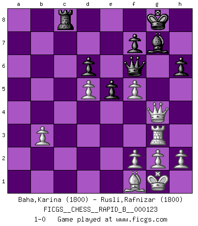 Last move : 1-0 2009 November 29 21:1:15 [Event "FICGS__CHESS__RAPID_B__000123"] [Site "FICGS"] [Date "2009.06.27"] [Round "1"] [White "Baha,Karina"] [Black "Rusli,Rafnizar"] [Result "1-0"] [WhiteElo "1800"] [BlackElo "1800"] 1.e4 c5 2.Nf3 Nc6 3.d4 cxd4 4.Nxd4 e5 5.Nb5 d6 6.N1c3 a6 7.Na3 Nf6 8.Bg5 b5 9.Bxf6 gxf6 10.Nd5 Bg7 11.Bd3 Ne7 12.Nxe7 Qxe7 13.O-O O-O 14.c4 b4 15.Nc2 Rb8 16.Ne3 Be6 17.Qf3 Rfc8 18.b3 a5 19.Nd5 Qd8 20.Rae1 Ra8 21.Qh5 a4 22.Re3 axb3 23.axb3 f5 24.exf5 Bxd5 25.cxd5 Qf6 26.Rh3 h6 27.Qg4 Rc3 28.Qxb4 Rac8 29.Rg3 Rc1 30.Qg4 Rxf1+ 31.Bxf1 1-0 This chess game has been lost on time (started : 2009.06.27 15:4:14) Sicilian : Labourdonnais-Loewenthal (Kalashnikov) variation Kingside Castling by player White (move 13) Kingside Castling by player Black (move 13) Player White won this chess game. Follow this game move after move (download)The mistakes are there, waiting to be made. (Savielly Tartakower) Wenn du nicht weißt was du tun sollst, warte bis dein Gegner eine Idee hat. Sie wird sicher schlecht sein. (Siegbert Tarrasch) En la vida, como en el Ajedrez, los Peones propios obstruyen nuestro camino. La gran fortuna de un hombre, su comodidad, placer, hijos, libros, que deberían ayudarle a ganar, con mucha frecuencia lo ponen en Jaque Mate. (Charles Buxton) J'ai toujours senti une vague pitié pour l'homme qui ne connaît rien aux échecs, tout comme j'en aurais pour un homme ignorant de l'amour. Les Echecs, comme la musique ou comme l'amour, ont le pouvoir de rendre heureux. (Siegbert Tarrasch) Life is verb, not a noun. (Charlotte Perkins Gilman)