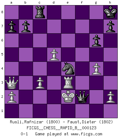 Last move : 0-1 2009 October 2 13:16:13 [Event "FICGS__CHESS__RAPID_B__000123"] [Site "FICGS"] [Date "2009.06.27"] [Round "1"] [White "Rusli,Rafnizar"] [Black "Faust,Dieter"] [Result "0-1"] [WhiteElo "1800"] [BlackElo "1802"] 1.d4 Nf6 2.c4 c5 3.d5 e6 4.Nc3 exd5 5.cxd5 d6 6.e4 g6 7.Be2 Bg7 8.Nf3 O-O 9.Bf4 Bg4 10.Nd2 Bxe2 11.Qxe2 Nh5 12.Be3 f5 13.exf5 Rxf5 14.g4 Nf4 15.Bxf4 Rxf4 16.O-O-O Nd7 17.Qe6+ Kh8 18.Nde4 Bxc3 19.bxc3 Nf8 20.Qxd6 Rxe4 21.Qxc5 Rc8 22.Qa3 Qf6 23.Rd3 Nd7 24.f3 Nc5 25.fxe4 Nxd3+ 26.Kd2 Nc5 27.Re1 Qf4+ 28.Re3 Nxe4+ 29.Ke2 Qf2+ 0-1 Benoni : 6.e4 Kingside Castling by player Black (move 8) Queenside Castling by player White (move 16) Player Black won this chess game. Follow this game move after move (download)I feel as if I were a piece in a game of Chess, when my opponent says of it: That piece cannot be moved. (Soren Kierkegaard) Wer nie einen Fehler gemacht hat, hat nie etwas Neues ausprobiert. (Albert Einstein) Las Aperturas te enseñan aperturas. ¡Los Finales te enseñan Ajedrez!. (Stephan Gerzadowicz) Pour moi, les échecs ne sont pas un jeu mais un art. (Alexandre Alekhine) The problem with manipulation is that people can turn on you. (Horatio Caine, C.S.I. Miami)