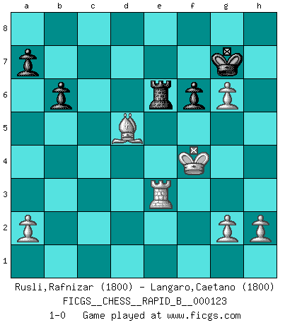 Last move : 1-0 2009 November 17 15:6:25 [Event "FICGS__CHESS__RAPID_B__000123"] [Site "FICGS"] [Date "2009.06.27"] [Round "1"] [White "Rusli,Rafnizar"] [Black "Langaro,Caetano"] [Result "1-0"] [WhiteElo "1800"] [BlackElo "1800"] 1.d4 Nf6 2.c4 e6 3.Nf3 d5 4.Nc3 c5 5.cxd5 Nxd5 6.e4 Nxc3 7.bxc3 cxd4 8.cxd4 Bb4+ 9.Bd2 Bxd2+ 10.Qxd2 O-O 11.Bd3 b6 12.Rc1 Bb7 13.O-O Nc6 14.d5 exd5 15.exd5 Ne7 16.d6 Nd5 17.Ng5 Qxd6 18.Bxh7+ Kh8 19.Bc2 Kg8 20.Rfd1 Qh6 21.Bh7+ Kh8 22.Be4 f6 23.Ne6 Qxd2 24.Rxd2 Rfe8 25.Rxd5 Bxd5 26.Bxd5 Rac8 27.Rd1 Rc2 28.f4 Re2 29.Rd3 Re1+ 30.Kf2 R8xe6 31.Rh3+ Kg8 32.f5 R1e2+ 33.Kf3 R2e3+ 34.Kf4 g5+ 35.fxg6 Kg7 36.Rxe3 1-0 Queen's pawn game Kingside Castling by player Black (move 10) Kingside Castling by player White (move 13) Player White won this chess game. Follow this game move after move (download)The hardest game to win is a won game. (Emanuel Lasker) Ich habe die besten Aussichten, den ersten Preis zu gewinnen - denn jeder muss gegen Steinitz spielen, nur ich nicht! (Wilhelm Steinitz) En la perfecta combinación de Ajedrez como en una historia corta de primera clase, toda la trama y contra trama deberá conducir hacia un final sorprendente, el interes no es mitigado hasta el último momento. (Yates and Winter) On n'a jamais que l'âge auquel on a commence à jouer aux échecs car après on cesse de vieillir. (Capablanca) You must do what you feel is right... of course. (Obi-Wan Kenobi in Star Wars ep.4)