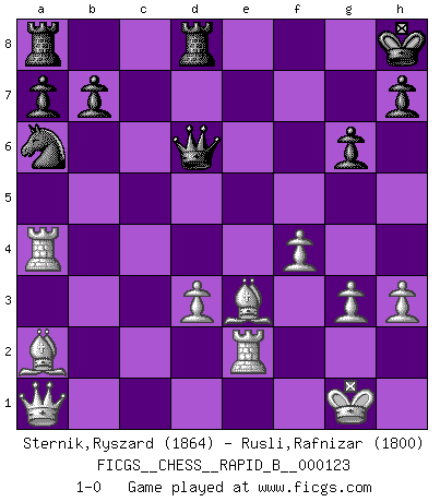 Last move : 1-0 2009 July 31 18:53:2 [Event "FICGS__CHESS__RAPID_B__000123"] [Site "FICGS"] [Date "2009.06.27"] [Round "1"] [White "Sternik,Ryszard"] [Black "Rusli,Rafnizar"] [Result "1-0"] [WhiteElo "1864"] [BlackElo "1800"] 1.e4 c5 2.Nc3 Nc6 3.g3 Nf6 4.Bg2 g6 5.d3 Bg7 6.f4 d6 7.h3 Qb6 8.Nf3 O-O 9.O-O Bd7 10.e5 Ne8 11.Re1 Nc7 12.Rb1 d5 13.a3 Rfd8 14.b4 cxb4 15.Be3 Qa5 16.axb4 Nxb4 17.Ra1 Na2 18.Nxa2 Na6 19.Nd4 e6 20.c4 Ba4 21.Nc3 Qxc3 22.Rxa4 Qb2 23.cxd5 exd5 24.Re2 Qb6 25.Nf5 Qb5 26.Nd6 Qd7 27.Bxd5 Bf8 28.Bxf7+ Kh8 29.Ba2 Bxd6 30.exd6 Qxd6 31.Qa1+ 1-0 Sicilian : Closed Kingside Castling by player Black (move 8) Kingside Castling by player White (move 9) Player White won this chess game. Follow this game move after move (download)Without error there can be no brilliancy. (Emanuel Lasker) Ohne Fehler kann es keine Brillanz geben. (Emanuel Lasker) Las leyes del Ajedrez no permiten una libre elección: tienes que mover quieras o no. (Emanuel Lasker) Il (Jacob Murray) ne joue pas pour le bon coup, mais pour le meilleur. (Eloi Relange) Never risk one's whole fortune unless supported by one's entire army. (Niccolo Machiavelli)
