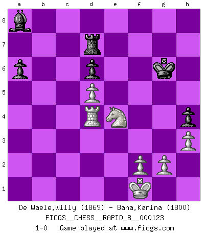Last move : 1-0 2009 October 3 18:35:32 [Event "FICGS__CHESS__RAPID_B__000123"] [Site "FICGS"] [Date "2009.06.27"] [Round "1"] [White "De Waele,Willy"] [Black "Baha,Karina"] [Result "1-0"] [WhiteElo "1869"] [BlackElo "1800"] 1.e4 e5 2.Nf3 Nc6 3.Bb5 a6 4.Ba4 Nf6 5.O-O Be7 6.Re1 b5 7.Bb3 d6 8.c3 O-O 9.h3 Bb7 10.d4 Re8 11.Nbd2 Bf8 12.a4 h6 13.Bc2 exd4 14.cxd4 Nb4 15.Bb1 c5 16.d5 Nd7 17.Ra3 c4 18.R1e3 Qc7 19.Nd4 Qb6 20.N2f3 Nc5 21.a5 Qa7 22.b3 Nbd3 23.bxc4 bxc4 24.Bxd3 cxd3 25.Nd2 g6 26.N4b3 Rac8 27.Re1 Bg7 28.Nxc5 Qxc5 29.Rxd3 Qxa5 30.Rb3 Ba8 31.Bb2 Bxb2 32.Rxb2 f5 33.Rb1 Qc5 34.Nf1 Qa5 35.Ng3 h5 36.Ra1 Qc3 37.exf5 Qxe1+ 38.Qxe1 Rxe1+ 39.Rxe1 h4 40.Ne4 Rd8 41.fxg6 Kg7 42.Rd1 Kxg6 43.Rd4 Rd7 44.Kf1 1-0 Ruy Lopez : Closed Kingside Castling by player White (move 5) Kingside Castling by player Black (move 8) Player White won this chess game. Follow this game move after move (download)The older I grow, the more I value pawns. (Paul Keres) Bobby Fischer ist kein Vorbild für die heutige Jugend. (Viktor Kortschnoi) No todos los artistas son jugadores de Ajedrez, pero todos los jugadores de Ajedrez son artistas. (Marcel Duchamp) Botvinnik disait en comparant les échecs à la musique: Il existe une science dont le but est l'étude de l'acoustique et des sons. Mais il y a aussi un art qui se sert de l'océan des sons : c'est la musique. De toute évidence, il en est de même pour la pensée. La logique est l'étude des lois de la réflexion et les échecs reflètent, en tant qu'art, le côté logique de la réflexion, sous la forme d'images artistiques... Extrait de Fischer - Spassky, Reykjavik 1972 par Alexander & F. Wyndham (Ed. Solar), p 37. We cannot be sure of having something to live for unless we are willing to die for it. (Ernesto Che Guevara)
