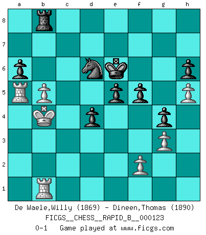 Last move : 0-1 2009 August 1 21:6:10 [Event "FICGS__CHESS__RAPID_B__000123"] [Site "FICGS"] [Date "2009.06.27"] [Round "1"] [White "De Waele,Willy"] [Black "Dineen,Thomas"] [Result "0-1"] [WhiteElo "1869"] [BlackElo "1890"] 1.e4 e6 2.d4 d5 3.Nc3 Nf6 4.Bg5 Bb4 5.e5 h6 6.Bd2 Bxc3 7.bxc3 Ne4 8.Qg4 g6 9.Bd3 Nxd2 10.Kxd2 c5 11.h4 Nc6 12.Qf4 cxd4 13.cxd4 Qa5+ 14.c3 b5 15.Ne2 b4 16.Rhc1 Rb8 17.cxb4 Rxb4 18.Ke1 Rxd4 19.Qd2 Qxd2+ 20.Kxd2 Rxd3+ 21.Kxd3 Nxe5+ 22.Kd4 Nc4 23.Rab1 Kd7 24.Nc3 Ba6 25.Nb5 g5 26.h5 Rb8 27.a4 Rb7 28.Rb3 f6 29.Rf3 f5 30.Ra1 Ke7 31.Rc3 Rd7 32.Kc5 e5 33.g3 g4 34.Re1 Kf6 35.Kc6 Rd8 36.Kc5 Rc8+ 37.Kb4 Bxb5 38.axb5 Rb8 39.Kc5 Ke6 40.Rd3 Rc8+ 41.Kb4 Nd6 42.Ra3 Rb8 43.Ra5 d4 44.Rb1 a6 0-1 French : MacCutcheon, Lasker variation Player Black won this chess game. Follow this game move after move (download)Pawns are born free, yet they are everywhere in chains. (Rick Kennedy) Vom Schach wurde gesagt das Leben sei dafür nicht lange genug. Aber das ist der Fehler des Lebens, nicht des Schach'. (Irving Chernev) Botvinnik trataba de restarle el misterio al Ajedrez, siempre relacionandolo a situaciones de la vida ordinaria. El gustaba de llamar al Ajedrez un típico problema inexacto similar a aquellos de los cuales la gente siempre tiene que enfrentarse en la vida cotidiana. (Garry Kasparov) J'ai vu le vaincu d'Echecs jouer des années durant dans l'espoir de la fête de la victoire. Car tu es plus riche de ce qu'elle existe si même elle n'est point pour toi. Ainsi de la perle du fond des mers. (Antoine de Saint-Exupéry) If I had no sense of humor, I would long ago have committed suicide. (Mahatma Gandhi)