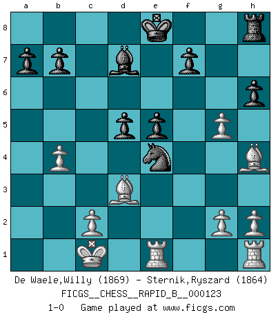 Last move : 1-0 2009 July 4 14:19:6 [Event "FICGS__CHESS__RAPID_B__000123"] [Site "FICGS"] [Date "2009.06.27"] [Round "1"] [White "De Waele,Willy"] [Black "Sternik,Ryszard"] [Result "1-0"] [WhiteElo "1869"] [BlackElo "1864"] 1.e4 c5 2.Nf3 Nc6 3.d4 cxd4 4.Nxd4 Nf6 5.Nc3 d6 6.Bg5 Bd7 7.Qd2 Rc8 8.O-O-O Nxd4 9.Qxd4 Qa5 10.f4 Rxc3 11.bxc3 e5 12.Qb4 Qxb4 13.cxb4 Nxe4 14.Bh4 g5 15.fxg5 Be7 16.Re1 d5 17.a3 h6 18.Bd3 Bxb4 19.axb4 1-0 Sicilian defense Queenside Castling by player White (move 8) Player White won this chess game. Follow this game move after move (download)Daring ideas are like Chess men moved forward. They may be beaten, but they may start a winning game. (Johann Wolfgang von Goethe) Die Auseinandersetzung mit Karpow war politisch geprägt. Er stand für das kommunistische System, wurde von dessen Repräsentanten gehätschelt. Ich war der Oppositionelle. Jeder Schachweltmeister spiegelt auch die gesellschaftlichen Verhältnisse wider. Kramnik steht für die Börsen-Generation des Neuen Markts, ideologiefrei, zahlenfixiert. (Garry Kasparov) Los Peones son el alma de una partida de Ajedrez. (Francois Andre Danican Philidor) Les Echecs mettent en conflit, non pas deux intelligences, mais deux volontés. (Lasker) Internal peace cannot coexist with external war. (Don Groves)