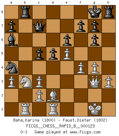 Last move : 0-1 2009 December 6 21:19:3 [Event "FICGS__CHESS__RAPID_B__000123"] [Site "FICGS"] [Date "2009.06.27"] [Round "1"] [White "Baha,Karina"] [Black "Faust,Dieter"] [Result "0-1"] [WhiteElo "1800"] [BlackElo "1802"] 1.e4 e6 2.d4 d5 3.Nc3 Bb4 4.e5 Ne7 5.a3 Bxc3+ 6.bxc3 c5 7.Qg4 Kf8 8.Nf3 Qa5 9.Bd2 Qa4 10.Ra2 b6 11.Bd3 Ba6 12.Qf4 Ng6 13.Bxg6 hxg6 14.Ng5 Qe8 15.dxc5 bxc5 16.f3 Nd7 17.Kf2 Nb6 18.Bc1 Qe7 19.Rb2 Kg8 20.Re1 Rd8 21.Kg1 Qc7 22.Rb1 Rh5 23.h3 Qe7 24.g4 Rh8 25.Qg3 Bc8 26.f4 Nc4 27.Nf3 Qc7 28.Nd2 Nb6 29.Nb3 Na4 30.Bd2 Ba6 31.Red1 Rb8 0-1 This chess game has been lost on time (started : 2009.06.27 15:4:14) French : Winawer, Advance variation Player Black won this chess game. Follow this game move after move (download)A Chess game is a dialogue, a conversation between a player and his opponent. Each move by the opponent may contain threats or be a blunder, but a player cannot defend against threats or take advantage of blunders if he does not first ask himself: What is my opponent planning after each move ? (Bruce A. Moon) In Buenos Aires ist es nicht mein vorrangiges Ziel ein starkes Turnier zu organisieren, sondern ein Turnier für Gentlemen. Ich würde nie Kamsky einladen. Ich mag keine Probleme. (Miguel Najdorf) EL Ajedrez es como la vida. (Boris Spassky) Même si vous avez un bon coup à faire, regardez toujours s'il n'y en a pas un qui lui soit préférable. (Pedro Damiano) If things go wrong, don't go with them. (Roger Babson)