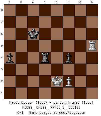 Last move : 0-1 2009 September 23 19:49:56 [Event "FICGS__CHESS__RAPID_B__000123"] [Site "FICGS"] [Date "2009.06.27"] [Round "1"] [White "Faust,Dieter"] [Black "Dineen,Thomas"] [Result "0-1"] [WhiteElo "1802"] [BlackElo "1890"] 1.d4 Nf6 2.Nf3 d5 3.c4 c6 4.Nc3 e6 5.e3 Nbd7 6.Qc2 Bd6 7.b3 O-O 8.Be2 b6 9.O-O Bb7 10.Rd1 Qe7 11.Bb2 Rac8 12.e4 dxe4 13.Nxe4 Nxe4 14.Qxe4 Nf6 15.Qh4 Rfd8 16.Bd3 h6 17.Re1 Ba3 18.Bc3 Bb4 19.Bxb4 Qxb4 20.Be4 Qf8 21.Qf4 Nxe4 22.Qxe4 Rc7 23.Qe3 c5 24.dxc5 Qxc5 25.Rad1 Rcd7 26.Rxd7 Rxd7 27.Kf1 Qf5 28.Qe5 Bxf3 29.Qxf5 Bxg2+ 30.Kxg2 exf5 31.Re5 g6 32.a4 Kg7 33.a5 Kf6 34.Rb5 bxa5 35.Rxa5 Rb7 36.Ra3 Ke5 37.c5 Kd5 38.b4 Kc4 39.Ra1 Rc7 40.Rb1 Kb5 41.Kf3 Re7 42.h4 Re4 43.h5 gxh5 44.Kg3 a6 45.Rb2 Rg4+ 46.Kh3 Rc4 47.Kg3 Kc6 48.Rd2 f4+ 49.Kf3 Rxb4 50.Rd6+ Kb7 51.Rd7+ Kb8 52.Rxf7 a5 53.Rh7 a4 54.Rxh6 Kb7 55.c6+ Kc7 56.Rxh5 Kxc6 57.Ke2 Rd4 0-1 Queen's pawn game Kingside Castling by player Black (move 7) Kingside Castling by player White (move 9) 10 pieces endgame at move 52 : White KRPP , Black KRPPPP WHITE : King + 1 Rook 2 Pawns BLACK : King + 1 Rook 4 Pawns 9 pieces endgame at move 54 : White KRPP , Black KRPPP WHITE : King + 1 Rook 2 Pawns BLACK : King + 1 Rook 3 Pawns 8 pieces endgame at move 56 : White KRPP , Black KRPP WHITE : King + 1 Rook 2 Pawns BLACK : King + 1 Rook 2 Pawns 7 pieces endgame at move 56 : White KRP , Black KRPP WHITE : King + 1 Rook 1 Pawn BLACK : King + 1 Rook 2 Pawns Player Black won this chess game. Follow this game move after move (download)Good offense and good defense both begin with good development. (Bruce A. Moon) Schach ist ein Kampf gegen den Fehler. (Johannes Herrman Zukertort) La partida mas dura de ganar es una partida ganada. (Emanuel Lasker) Les réformistes prétendent que les progrès de la théorie conduiront à la disparition des échecs, et qu'il faut, pour leur rendre vie, en remanier les règles. En réalité, qu'exprime cette affirmation? Le mépris de l'intuition, de l'imagination et de tous les autres éléments qui font des échecs un art. (Alexander Alekhine) No, no, you're not thinking; you're just being logical. (Niels Bohr)