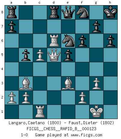 Last move : 1-0 2009 October 3 12:21:39 [Event "FICGS__CHESS__RAPID_B__000123"] [Site "FICGS"] [Date "2009.06.27"] [Round "1"] [White "Langaro,Caetano"] [Black "Faust,Dieter"] [Result "1-0"] [WhiteElo "1800"] [BlackElo "1802"] 1.e4 e6 2.d4 d5 3.Nd2 c5 4.Ngf3 Nf6 5.exd5 Nxd5 6.dxc5 Bxc5 7.Ne4 Be7 8.Bc4 O-O 9.O-O Nc6 10.Qe2 Qc7 11.Rd1 Rd8 12.Bg5 f6 13.Bd2 Ne5 14.Bb3 Ng6 15.g3 Qc6 16.h4 Nf8 17.Nd4 Qe8 18.h5 h6 19.c4 Nc7 20.Be3 e5 21.c5 Kh8 22.Qc4 Be6 23.Nxe6 Ncxe6 24.Nd6 Bxd6 25.Rxd6 b5 26.Qd5 Qxh5 27.Rd1 Qe8 28.Rc1 1-0 French : Tarrasch, Open variation Kingside Castling by player Black (move 8) Kingside Castling by player White (move 9) Player White won this chess game. Follow this game move after move (download)Pawns: they are the soul of this game, they alone form the attack and defense. (Philidor) Immer nach dem besten Zug zu suchen ist ziemlich unpraktisch. (Nigel Short) Un buen sacrificio es aquel que aunque no sea necesariamente sólido, deja a tu oponente aturdido y confuso. (Rudolph Spielmann) Dieu déplace le joueur, et celui-ci la pièce. Quel Dieu derrière Dieu commence donc la trame ? Arturo Perez-Reverte (prix de littérature policière 1993). All battles are fought by scared men who'd rather be someplace else. (John Wayne in the movie In harm's way)