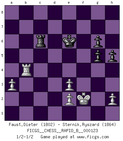 Last move : 1/2-1/2 2009 September 1 14:10:53 [Event "FICGS__CHESS__RAPID_B__000123"] [Site "FICGS"] [Date "2009.06.27"] [Round "1"] [White "Faust,Dieter"] [Black "Sternik,Ryszard"] [Result "1/2-1/2"] [WhiteElo "1802"] [BlackElo "1864"] 1.d4 Nf6 2.Nf3 e6 3.c4 b6 4.g3 Ba6 5.b3 Bb4+ 6.Bd2 Be7 7.Bg2 c6 8.Bc3 d5 9.Ne5 Ne4 10.O-O Nxc3 11.Nxc3 O-O 12.Rc1 f6 13.Nd3 dxc4 14.Nf4 Qd7 15.d5 exd5 16.Ncxd5 Ba3 17.Rc3 Bb2 18.Rc2 Be5 19.bxc4 Bb7 20.Ne3 Rd8 21.Qxd7 Rxd7 22.c5 Bd4 23.Ne6 Bxe3 24.fxe3 Kf7 25.Nd4 bxc5 26.Rxc5 a5 27.Rb1 g6 28.Kf2 Re7 29.Rc3 a4 30.a3 Ra5 31.Rc4 Ra7 32.g4 Nd7 33.Rxb7 Rxb7 34.Nxc6 Re8 35.Nd8+ Rxd8 36.Bxb7 Nb6 37.Rb4 Rd6 38.Be4 Ke6 39.Bc2 Rc6 40.g5 fxg5 41.Bxa4 Nxa4 42.Rxa4 h5 43.Rb4 1/2-1/2 Queen's pawn game Kingside Castling by player White (move 10) Kingside Castling by player Black (move 11) This chess game ended in a draw. Follow this game move after move (download)Personally, I rather look forward to a computer program winning the world Chess Championship. Humanity needs a lesson in humility. (Richard Dawkings) Jeder weiß, dass Gasprom Putins persönliches Machtinstrument ist. Die Firma wird vom Kreml aus geleitet und wird schon deshalb nie transparent sein. (Garry Kasparov) El Ajedrez es un mar en el cual un mosquito puede beber y un elefante puede bañarse. (Refrán Hindú) Celui qui prend des risques peut perdre, celui qui n'en prend pas perd toujours. (Xavier Tartacover) The beginning of wisdom is silence. The second step is listening. (Unknown)