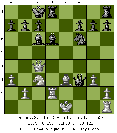 Last move : 0-1 2009 July 21 9:41:55 [Event "FICGS__CHESS__CLASS_D__000125"] [Site "FICGS"] [Date "2009.06.28"] [Round "1"] [White "Denchev,Stanimir"] [Black "Cridland,Graham"] [Result "0-1"] [WhiteElo "1659"] [BlackElo "1653"] 1.d4 d5 2.Nf3 Nc6 3.c4 dxc4 4.e4 Bg4 5.Be3 e5 6.d5 Bxf3 7.Qa4 Bxe4 8.dxc6 Bxc6 9.Qxc4 Nf6 10.Nc3 Qd7 11.Rd1 Qg4 12.Qd3 Bd6 13.f3 Qb4 14.Rd2 O-O-O 15.a3 Qh4+ 16.g3 Qh5 17.Bg2 e4 18.Qc4 exf3 19.Bxf3 Qxf3 0-1 Queen's pawn game, Chigorin variation Queenside Castling by player Black (move 14) Player Black won this chess game. Follow this game move after move (download)Chess is so inspiring that I do not believe a good player is capable of having an evil thought during the game. (Wilhelm Steinitz) Es hat in meinem Leben Zeiten gegeben, in denen das Schachspiel, wenn nicht zum Lebenszweck, so doch zu einem regelrechten Lebensersatz geworden ist. Man fühlt sich in solchen Zeiten nicht so, als besäße man eine göttliche Gabe, sondern eher so, als sei man von ihr besessen. (Garry Kasparov) Si tu oponente te ofrece un empate, trata de averiguar porque piensa él que esta en una posición peor. (Nigel Short) Karpov est une pièce de musée. (Garry Kasparov) There's always a bigger fish. (Qui-Gon Jinn in Star Wars ep.1)