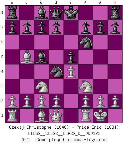 Last move : 0-1 2009 August 26 9:31:16 [Event "FICGS__CHESS__CLASS_D__000125"] [Site "FICGS"] [Date "2009.06.28"] [Round "1"] [White "Czekaj,Christophe"] [Black "Price,Eric"] [Result "0-1"] [WhiteElo "1646"] [BlackElo "1631"] 1.Nc3 Nf6 2.e4 e5 3.Nf3 Nc6 4.Bb5 Nd4 5.O-O Bc5 0-1 This chess game has been lost on time (started : 2009.06.28 18:49:19) Dunst (Sleipner, Heinrichsen) Opening Kingside Castling by player White (move 5) Player Black won this chess game. Follow this game move after move (download)When I asked Fischer why he had not played a certain move in our game, he replied: 'Well, you laughed when I wrote it down !' (Mikhail Tal) Ich glaube nicht an Psychologie, ich glaube an gute Züge. (Robert James Fischer) Cuando no sepas que mover, espera por una idea que se le venga a la la cabeza de tu oponente. Tenlo por seguro de que esa idea estará incorrecta. (Siegbert Tarrasch) J'ai vu le vaincu d'Echecs jouer des années durant dans l'espoir de la fête de la victoire. Car tu es plus riche de ce qu'elle existe si même elle n'est point pour toi. Ainsi de la perle du fond des mers. (Antoine de Saint-Exupéry) Those parts of the system that you can hit with a hammer (not advised) are called hardware; those program instructions that you can only curse at are called software. (Anonymous)