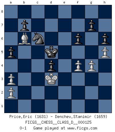 Last move : 0-1 2009 August 31 18:37:40 [Event "FICGS__CHESS__CLASS_D__000125"] [Site "FICGS"] [Date "2009.06.28"] [Round "1"] [White "Price,Eric"] [Black "Denchev,Stanimir"] [Result "0-1"] [WhiteElo "1631"] [BlackElo "1659"] 1.e4 c5 2.Nf3 Nc6 3.d4 cxd4 4.Nxd4 Nf6 5.Nc3 d6 6.Bg5 Nxe4 7.Nxe4 Qa5+ 8.c3 Qe5 9.Nb5 Qxe4+ 10.Be3 Kd8 11.Qd2 Bf5 12.f3 Qc2 13.Bc4 e6 14.Rd1 d5 15.Bb3 Qxd2+ 16.Rxd2 Kc8 17.h4 h6 18.Bf4 Bc5 19.g4 Bh7 20.Bc2 Bxc2 21.Rxc2 Kd7 22.Bg3 a6 23.Na3 Bxa3 24.bxa3 Na5 25.Rb2 Rac8 26.Rc2 Rc4 27.Be5 f6 28.Bd4 Rhc8 29.Kd2 e5 30.Bb6 Nc6 31.Rhc1 Ne7 32.Ba5 d4 33.cxd4 Rxc2+ 34.Rxc2 Rxc2+ 35.Kxc2 exd4 36.Bb6 Nc6 37.f4 Kd6 38.Kd3 Kd5 39.h5 a5 0-1 Sicilian defense Player Black won this chess game. Follow this game move after move (download)There must have been a time when men were demigods, or they could not have invented Chess. (Gustav Schenk) Nicht daß Diemer aus Opportunismus Mitglied der NSDAP geworden wäre. Er war ein Fanatiker, in allem, was er tat. (Hans Ree) Un buen sacrificio es aquel que aunque no sea necesariamente sólido, deja a tu oponente aturdido y confuso. (Rudolph Spielmann) Même si vous avez un bon coup à faire, regardez toujours s'il n'y en a pas un qui lui soit préférable. (Pedro Damiano) Question: Is 'This statement is paradoxical' a paradoxical statement ? Or is it a meta-paradox ? (Normajean Yates)