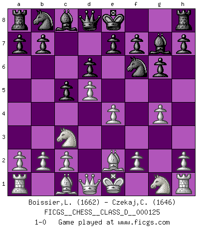 Last move : 1-0 2009 August 28 9:34:45 [Event "FICGS__CHESS__CLASS_D__000125"] [Site "FICGS"] [Date "2009.06.28"] [Round "1"] [White "Boissier,Lucien"] [Black "Czekaj,Christophe"] [Result "1-0"] [WhiteElo "1662"] [BlackElo "1646"] 1.d4 d6 2.e4 Nf6 3.Nc3 g6 4.Be2 Bg7 5.g4 c5 6.d5 1-0 This chess game has been lost on time (started : 2009.06.28 18:49:19) Queen's Pawn Player White won this chess game. Follow this game move after move (download)The tactician knows what to do when there is something to do; whereas the strategian knows what to do when there is nothing to do. (Gerald Abrahams) Das Schachspiel übertrifft alle anderen Spiele so weit wie der Chimborasso einen Misthaufen. (Arthur Schopenhauer) Tu sabes que vas a perder. Aún cuando tenía la ventaja, yo sabía que iba a perder. - al estar jugando con Fischer (Andrew Soltis) Ne tendez aucun piège pour le plaisir ! Ne jouez rien dans l'espoir que l'adversaire réagisse de façon stupide ! Prenez toujours pour acquis que l'adversaire va trouver le meilleur coup ! Ne jouez jamais de coup dans l'espoir que l'adversaire ne voie pas la menace ! Chacun de vos coups doit améliorer la position d'une façon ou d'une autre. A good programmer is someone who always looks both ways before crossing a one-way street. (Doug Linder)