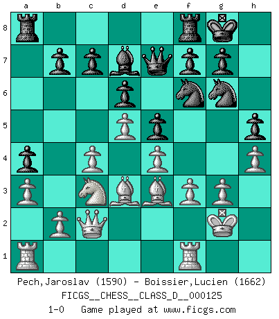 Last move : 1-0 2009 December 20 16:27:9 [Event "FICGS__CHESS__CLASS_D__000125"] [Site "FICGS"] [Date "2009.06.28"] [Round "1"] [White "Pech,Jaroslav"] [Black "Boissier,Lucien"] [Result "1-0"] [WhiteElo "1590"] [BlackElo "1662"] 1.d4 Nf6 2.c4 e6 3.Nc3 Bb4 4.e3 O-O 5.Bd3 Nc6 6.Nge2 d6 7.O-O e5 8.d5 Ne7 9.a3 Bxc3 10.Nxc3 a5 11.Qb3 Nf5 12.f3 Bd7 13.Qc2 Nh4 14.e4 Ng6 15.g3 h5 16.h4 a4 17.Be3 Qe7 18.Kg2 1-0 This chess game has been lost on time (started : 2009.06.28 18:49:19) Nimzo-Indian : 4.e3 O-O, 5.Bd3 Kingside Castling by player Black (move 4) Kingside Castling by player White (move 7) Player White won this chess game. Follow this game move after move (download)I love all positions. Give me a difficult positional game, I will play it. But totally won positions, I cannot stand them. (Hein Donner) Es ist schade, dass viele Schachsportler vergessen, wie wichtig Auftreten und angemessene Kleidung sind. (Alexandra Kosteniuk) El Ajedrez es el arte del análisis. (Mikhail Botvinnik) Ce qui est bien, c'est d'avoir tout un tas de pièces en prise : l'adversaire ne peut en prendre qu'une à la fois. Cité par Thierry Audin. In God we trust, all others we virus scan. (Anonymous)