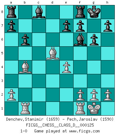 Last move : 1-0 2009 October 20 21:40:31 [Event "FICGS__CHESS__CLASS_D__000125"] [Site "FICGS"] [Date "2009.06.28"] [Round "1"] [White "Denchev,Stanimir"] [Black "Pech,Jaroslav"] [Result "1-0"] [WhiteElo "1659"] [BlackElo "1590"] 1.Nf3 Nf6 2.d4 g6 3.c4 Bg7 4.Nc3 d5 5.cxd5 Nxd5 6.e4 Nxc3 7.bxc3 c5 8.Be3 Qa5 9.Qd2 Nc6 10.Bc4 O-O 11.O-O cxd4 12.cxd4 Qxd2 13.Bxd2 Nxd4 14.Nxd4 Bxd4 15.Rab1 b6 16.Bb4 Bf6 17.Bd5 1-0 This chess game has been lost on time (started : 2009.06.28 18:49:19) Reti Opening Kingside Castling by player Black (move 10) Kingside Castling by player White (move 11) Player White won this chess game. Follow this game move after move (download)When I have White, I win because I am white; When I have Black, I win because I am Bogolyubov. (Bogolyubov) Der Traum, für den ich lebe, ist der von einem freien Russland. Viele mögen sagen: Russland hat doch ein Parlament, einen gewählten Präsidenten. Aber ich spüre, dass in meiner Heimat die Angst wiederkehrt. Eine Angst, sich frei zu äußern, bestimmte Dinge zu tun (Garry Kasparov) El Ajedrez es como la guerra en un tablero. (Bobby Fischer) Les Echecs sont et restent toujours un combat, un combat intégral comme la boxe, la lutte ou un autre sport, et où il doit y avoir un vainqueur et un vaincu. (Joseph Emil Diemer) Always remember that you are unique; just like everyone else. (Unknown)