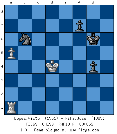 Last move : 1-0 2009 July 24 15:35:19 [Event "FICGS__CHESS__RAPID_A__000065"] [Site "FICGS"] [Date "2009.06.29"] [Round "1"] [White "Lopez,Victor"] [Black "Riha,Josef"] [Result "1-0"] [WhiteElo "1961"] [BlackElo "1989"] 1.e4 e6 2.d4 d5 3.Nd2 c5 4.Ngf3 a6 5.exd5 exd5 6.Be2 c4 7.O-O Bd6 8.b3 b5 9.a4 Bb7 10.bxc4 bxc4 11.Bxc4 dxc4 12.Nxc4 Be7 13.Re1 Bd5 14.Nce5 Nd7 15.Ba3 Ra7 16.c4 Bxf3 17.Nxf3 Kf8 18.c5 Rc7 19.Bb4 Qa8 20.Qb3 a5 21.Bd2 g6 22.h4 Kg7 23.Ng5 Bxg5 24.hxg5 h6 25.Bc3 hxg5 26.d5 Ngf6 27.c6 Qb8 28.Qa3 g4 29.Re7 g3 30.Qb2 gxf2+ 31.Kxf2 Rb7 32.cxb7 Qf4+ 33.Ke2 Qg4+ 34.Kd2 Qxg2+ 35.Kc1 Rh1+ 36.Re1 Qg5+ 37.Kb1 Rxe1+ 38.Bxe1 Qf5+ 39.Ka2 Qxd5+ 40.Qb3 Qxb3+ 41.Kxb3 Nc5+ 42.Kc4 Nxb7 43.Kb5 g5 44.Bxa5 Kg6 45.Bb6 Nd6+ 46.Kc6 Nc4 47.Kc5 Nd7+ 48.Kxc4 Nxb6+ 49.Kd4 g4 50.a5 1-0 French : Tarrasch, Open variation Kingside Castling by player White (move 7) 10 pieces endgame at move 42 : White KRBP , Black KNNPPP WHITE : King + 1 Rook 1 Bishop 1 Pawn BLACK : King + 2 Knights 3 Pawns 9 pieces endgame at move 44 : White KRBP , Black KNNPP WHITE : King + 1 Rook 1 Bishop 1 Pawn BLACK : King + 2 Knights 2 Pawns 8 pieces endgame at move 48 : White KRBP , Black KNPP WHITE : King + 1 Rook 1 Bishop 1 Pawn BLACK : King + 1 Knight 2 Pawns 7 pieces endgame at move 48 : White KRP , Black KNPP WHITE : King + 1 Rook 1 Pawn BLACK : King + 1 Knight 2 Pawns Player White won this chess game. Follow this game move after move (download)No price is too great for the scalp of the enemy King. (Koblentz) Ich habe Putins Aufstieg an die Macht beobachtet und seine Politik, die demokratischen Institutionen meines Landes zu zerstören. (Garry Kasparov) El Ajedrez expande y enriquece tu mente. (Saudin Robovic) Je menace de comprendre la position. (Anonyme) Only sick music makes money today. (Friedrich Nietzsche)