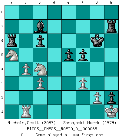 Last move : 0-1 2009 July 20 3:32:41 [Event "FICGS__CHESS__RAPID_A__000065"] [Site "FICGS"] [Date "2009.06.29"] [Round "1"] [White "Nichols,Scott"] [Black "Soszynski,Marek"] [Result "0-1"] [WhiteElo "2089"] [BlackElo "1979"] 1.e4 d5 2.exd5 Qxd5 3.Nc3 Qd6 4.d4 g6 5.Bb5+ Nd7 6.Nge2 Ngf6 7.Bf4 Qb6 8.Qd3 a6 9.Bc4 Bg7 10.O-O O-O 11.a4 c5 12.a5 Qd8 13.Rfd1 cxd4 14.Qxd4 Nh5 15.Qd3 Nxf4 16.Nxf4 Qe8 17.Nfd5 Ne5 18.Qe2 Bg4 19.f3 Be6 20.Bb3 Rc8 21.Ba4 Nc6 22.Nf4 Bf5 23.Kh1 g5 24.Nfd5 e6 25.Nb6 Rc7 26.Rd2 Qe7 27.Bxc6 bxc6 28.Nca4 h5 29.Qxa6 g4 30.Qe2 Bh6 31.R2d1 Bf4 32.Qf2 Qg5 33.Nc4 g3 34.Qe2 Qh4 35.h3 Kh8 36.Ne3 Bxh3 37.Nf1 Bf5 38.Kg1 Qe7 39.a6 e5 40.Qc4 h4 41.Qc5 Kg7 42.Qxe7 Rxe7 43.Nc5 Ra7 44.c3 Rfa8 45.Re1 Bc8 46.Ra4 f6 47.Rd1 Kg6 48.Rd8 h3 49.Rh8 Kg7 50.Rxc8 h2+ 51.Kh1 Rxc8 52.Nxg3 Kg6 53.Nf1 Rca8 54.Re4 Bh6 55.Ne3 Rh7 56.Nc4 Bf8 57.Nb3 Rxa6 58.Nba5 Bc5 59.b4 Bb6 60.Re1 Bc7 61.Rb1 f5 0-1 Scandinavian : Pytel-Wade variation Kingside Castling by player White (move 10) Kingside Castling by player Black (move 10) Player Black won this chess game. Follow this game move after move (download)Whoever sees no other aim in the game than that of giving checkmate to one's opponent will never become a good Chess player. (Euwe) Wenn ich Weiß habe gewinne ich weil ich Weiß habe, wenn ich Schwarz habe gewinne ich weil ich Bogoljubov bin. (Efim Bogoljubov) Si el ingenio solamente fuese necesario para lucirse, las mujeres serían las mejores jugadoras de Ajedrez del mundo. (Albin) Même si vous avez un bon coup à faire, regardez toujours s'il n'y en a pas un qui lui soit préférable. (Pedro Damiano) History is the quarrels of popes and kings, with wars or pestilences in every page; the men all so good for nothing, and hardly any women at all. (Jane Austen)