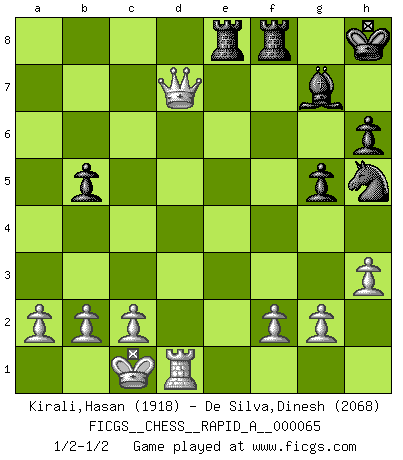 Last move : 1/2-1/2 2009 October 15 8:55:10 [Event "FICGS__CHESS__RAPID_A__000065"] [Site "FICGS"] [Date "2009.06.29"] [Round "1"] [White "Kirali,Hasan"] [Black "De Silva,Dinesh"] [Result "1/2-1/2"] [WhiteElo "1918"] [BlackElo "2068"] 1.e4 c5 2.Nf3 d6 3.d4 cxd4 4.Nxd4 Nf6 5.Nc3 a6 6.Be3 Ng4 7.Bg5 h6 8.Bh4 g5 9.Bg3 Bg7 10.h3 Nf6 11.Qf3 Qb6 12.O-O-O Nc6 13.Nxc6 Qxc6 14.Be2 Qc5 15.e5 dxe5 16.Rhe1 Be6 17.Bxe5 Qxe5 18.Bb5+ Qxb5 19.Nxb5 axb5 20.Qxb7 O-O 21.Rxe6 fxe6 22.Qc6 Kh8 23.Qxe6 Nh5 24.Qxe7 Rae8 25.Qd7 1/2-1/2 Sicilian : Najdorf, Byrne (English) attack Queenside Castling by player White (move 12) Kingside Castling by player Black (move 20) This chess game ended in a draw. Follow this game move after move (download)Best by test: 1. e4 (Bobby Fischer) Ein unbeabsichtigtes Patt ist der Gipfel der Dummheit. (Anonymous) Cuando la partida de Ajedrez termina, el Peón y el Rey regresan a la misma caja. (Irish saying) Nous vivons dans un monde échiquéen : chaque jour qui passe est un défi à relever. (Philosophe Sasha) Difficult things take a long time, impossible things a little longer. (Author unknown)