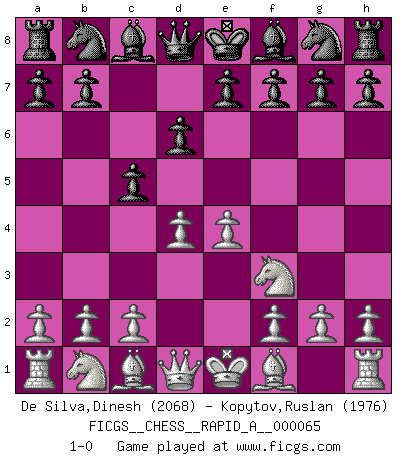 Last move : 1-0 2009 July 12 16:36:28 [Event "FICGS__CHESS__RAPID_A__000065"] [Site "FICGS"] [Date "2009.06.29"] [Round "1"] [White "De Silva,Dinesh"] [Black "Kopytov,Ruslan"] [Result "1-0"] [WhiteElo "2068"] [BlackElo "1976"] 1.e4 c5 2.Nf3 d6 3.d4 1-0 Sicilian Player White won this chess game. Follow this game move after move (download)Chess is above all, a fight ! (Emanuel Lasker) Ich verlor meine Bürgerrechte, mein Gehalt wurde mir nicht mehr bezahlt und ich wurde zensiert und durfte nicht mehr ins Ausland reisen. [nach dem Match Fischer-Taimanov 6:0] (Mark Taimanov) Cualquier cambio de material en una posición debe venir por medio de un mate, una captura o promoción de Peón. (Purdy) Les Echecs ont trois composantes : le temps, l'espace et le matériel en dernier. (Mikhail Tal) I've never seen so many men wasted so badly. (Blondie in The Good, The Bad and The Ugly)