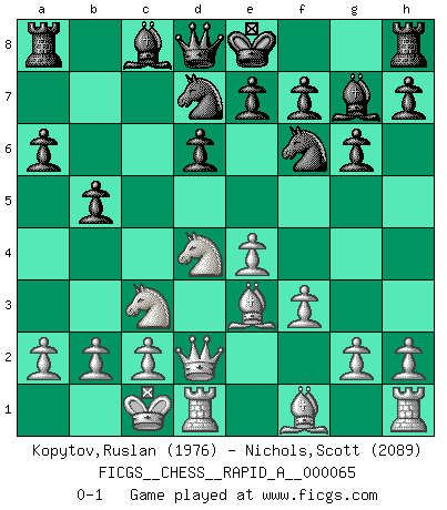 Last move : 0-1 2009 July 11 22:24:6 [Event "FICGS__CHESS__RAPID_A__000065"] [Site "FICGS"] [Date "2009.06.29"] [Round "1"] [White "Kopytov,Ruslan"] [Black "Nichols,Scott"] [Result "0-1"] [WhiteElo "1976"] [BlackElo "2089"] 1.e4 c5 2.Nf3 d6 3.d4 cxd4 4.Nxd4 Nf6 5.Nc3 a6 6.Be3 g6 7.f3 Bg7 8.Qd2 Nbd7 9.O-O-O b5 0-1 Sicilian : Najdorf, Byrne (English) attack Queenside Castling by player White (move 9) Player Black won this chess game. Follow this game move after move (download)Chess books should be used as we use glasses: to assist the sight, although some players make use of them as if they thought they conferred sight. (Jose Raul Capablanca) Wenn sie aufgeben, dann danke ich Ihnen für das Spiel (Eventualzug beim Fernschach). (Anonymous) Diferente gente reacciona diferentemente en aceptar la derrota. (Bobby Fischer) 'L'échange des dames est un coup dur pour les deux adversaires...' Un journaliste lors d'une partie du match Spassky-Fischer Empty your mind, be formless, shapeless — like water. (Bruce Lee)