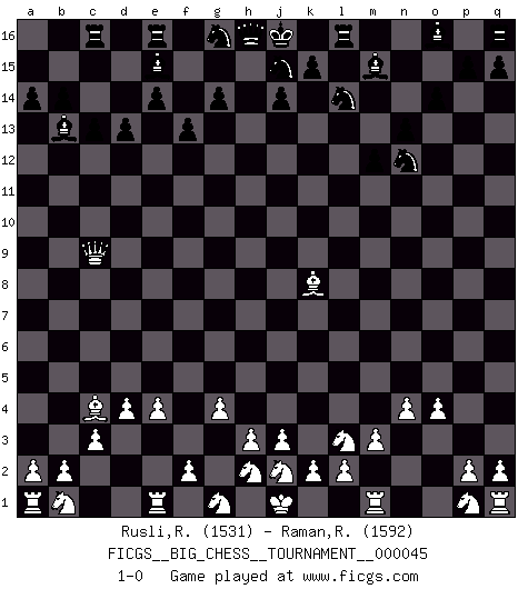 Last move : 1-0 2009 October 9 20:42:20 [Event "FICGS__BIG_CHESS__TOURNAMENT__000045"] [Site "FICGS"] [Date "2009.06.30"] [Round "1"] [White "Rusli,Rafnizar"] [Black "Raman,Ranganathan"] [Result "1-0"] [WhiteElo "1531"] [BlackElo "1592"] 1.g2-g4 p16-o14 2.h1-c6 b16-c14 3.n2-n4 m15-m13 4.o1-c12 e15-e14 5.m2-m3 d15-d13 6.c12-b13 l16-m15 7.c6-c7 c16-d15 8.k1-l3 a15-a14 9.b13-c14 d15-c14 10.c7-l15 k16-l14 11.d2-d4 m16-l16 12.l15-f10 h15-g13 13.l1-p5 f15-f13 14.f10-g11 f16-d14 15.g11-g8 c14-b13 16.g8-b8 n15-n13 17.p5-g13 h14-g13 18.b8-g13 g15-g14 19.e2-e4 d14-e15 20.g13-c9 c15-c13 21.f1-c4 a16-c16 22.c1-n11 m13-m12 23.n11-p13 o14-n12 24.p13-k8 o15-o14 25.o2-o4 b15-b14 26.c2-c3 1-0 This big chess game has been lost on time (started : 2009.06.30 18:39:50) Follow this game move after move (download)Mistrust is the most necessary characteristic of the Chess player. (Siegbert Tarrasch) Kasparov stellt für gewöhnlich die Regeln auf und bricht sie dann selbst wieder. (Alexej Shirov) Después de la respuesta de las negras a 1.e4 con 1..e5, se quedan siempre tratando de entrar dentro del juego. (Howard Staunton) Vous n'êtes pas toujours obligé de jouer le meilleur coup. Un coup doit être actif, entreprenant, correct et beau ! (David Bronstein) If you lose the game you should win the analysis! (Proverb)