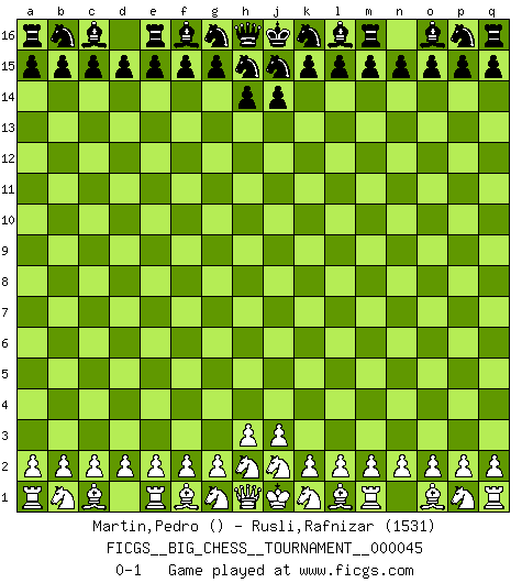 Last move : 0-1 2009 July 31 0:0:12 [Event "FICGS__BIG_CHESS__TOURNAMENT__000045"] [Site "FICGS"] [Date "2009.06.30"] [Round "1"] [White "Martin,Pedro"] [Black "Rusli,Rafnizar"] [Result "0-1"] [WhiteElo ""] [BlackElo "1531"] 0-1 This big chess game has been lost on time (started : 2009.06.30 18:39:50) Follow this game move after move (download)For surely of all the drugs in the world, Chess must be the most permanently pleasurable. (Assiac) Die westlichen Werte sind eine Sprache, welche die Putin-Administration nicht versteht. (Garry Kasparov) Tu puedes aprender mucho mas de una partida que pierdas que de una partida ganada. Tendras que perder cientos de partidas antes de llegar a ser un buen jugador. (Jose Raul Capablanca) Les erreurs sont comme les malheurs, elles n'arrivent jamais seules. (Siegbert Tarrasch) But they are useless. They can only give you answers. (Pablo Picasso, about computers)