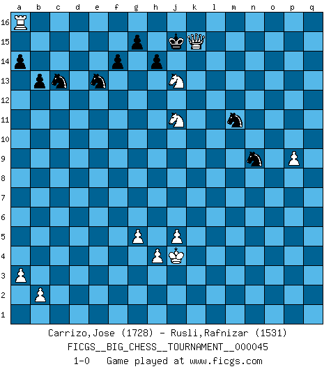 Last move : 1-0 2010 April 9 8:45:55 [Event "FICGS__BIG_CHESS__TOURNAMENT__000045"] [Site "FICGS"] [Date "2009.06.30"] [Round "1"] [White "Carrizo,Jose"] [Black "Rusli,Rafnizar"] [Result "1-0"] [WhiteElo "1728"] [BlackElo "1531"] 1.j2-k4 j15-h13 2.h1-o7 p16-o14 3.o7-l7 k16-l14 4.l7-c15 h16-o10 5.h2-g4 o10-o2 6.n2-n3 d15-d13 7.p1-o3 b16-a14 8.c15-o4 c16-k9 9.k4-m3 o2-o1 10.m1-o1 k9-c2 11.d2-d3 c2-a4 12.b1-c3 a4-f9 13.g2-g3 m15-m13 14.f1-g2 n15-n13 15.g2-e4 e15-e14 16.k2-k4 a16-c16 17.j3-j4 l16-p12 18.l1-h4 f9-d7 19.h4-q12 o16-n15 20.k1-j3 c16-c12 21.q12-k6 a14-c13 22.o3-m4 e16-c16 23.g1-f3 b15-b14 24.f3-e5 d7-g10 25.q1-p1 c13-e12 26.c1-d2 n15-j11 27.a1-c1 c12-c5 28.j1-h2 f16-d14 29.k6-l7 d14-b12 30.c3-b1 b12-g7 31.c1-c5 c16-c5 32.e1-c1 c5-e5 33.g4-e5 g7-e5 34.c1-c16 h15-f14 35.d2-c3 e5-d6 36.b1-d2 a15-a14 37.d2-c4 d6-f8 38.j3-h5 e12-c13 39.c4-e5 j16-h15 40.e5-g6 f8-g9 41.g6-h8 g10-h11 42.f2-f3 e14-e13 43.c16-a16 e13-e12 44.h8-k9 j11-k12 45.h5-j7 e12-e11 46.l7-h10 k12-h10 47.k9-h10 g9-j7 48.o4-l7 j7-f10 49.h10-g8 f10-g11 50.c3-j9 g11-j13 51.l7-b7 f14-d15 52.e4-j8 h13-f14 53.m4-l6 l14-m12 54.l6-j7 b14-b13 55.g8-h10 j13-g11 56.b7-f11 g11-e13 57.f11-h11 d13-d12 58.h10-g8 e13-j9 59.g8-j9 m16-m14 60.j9-l10 p12-o13 61.h11-j10 m14-l14 62.l10-m12 l14-l2 63.h2-j3 o13-j8 64.j10-j8 n13-m12 65.m3-k2 l2-m2 66.j7-l6 q16-n16 67.o1-n1 n16-n6 68.l6-m4 n6-o6 69.n1-n2 m2-n2 70.m4-n2 o6-o2 71.n2-m4 l15-l14 72.j8-k8 h15-j15 73.k8-p3 o2-o10 74.p3-p15 o14-n12 75.p15-m12 j15-h15 76.m12-d12 o10-n10 77.k2-l4 n10-l10 78.j3-k3 l10-h10 79.h3-h4 h10-g10 80.g3-g4 g10-e10 81.e2-e4 e10-f10 82.p1-f1 f10-d10 83.d12-e11 d10-d3 84.f1-f2 d3-d11 85.e11-k6 h15-j15 86.k6-q12 d11-d1 87.q12-q15 o15-o14 88.q15-q8 j15-h15 89.q8-k14 h15-j16 90.k14-m16 j16-h15 91.m16-l16 n12-l13 92.m4-k5 d1-k1 93.k3-l3 k1-l1 94.l3-m4 l1-m1 95.m4-l5 m1-m11 96.f2-o2 m11-l11 97.l5-m4 l11-m11 98.l4-m6 m11-f11 99.o2-o14 f11-f3 100.o14-o2 f3-f4 101.o2-g2 f4-e4 102.p2-p4 e4-e12 103.p4-p5 e12-j12 104.j4-j5 j12-a12 105.a2-a3 a12-m12 106.q2-q4 m12-q12 107.g2-q2 q12-g12 108.g4-g5 g12-b12 109.q4-q5 b12-b3 110.p5-p6 b3-k3 111.m4-l4 k3-n3 112.q5-q6 n3-p3 113.p6-p7 p3-p4 114.l4-k3 p4-p3 115.k3-j4 p3-p1 116.l16-p12 p1-j1 117.j4-h5 j1-k1 118.q6-q7 k1-k4 119.q7-q8 k4-o4 120.q8-q9 f14-d13 121.q9-q10 o4-o10 122.q10-q11 l13-n12 123.q11-q12 d13-f14 124.q12-q13 o10-h10 125.h5-j4 n12-o14 126.p12-p15 o14-q13 127.p15-k15 h15-g14 128.q2-q13 h10-p10 129.m6-n8 j14-j13 130.k15-l14 p10-p8 131.l14-m13 d15-b14 132.a16-a15 b14-d15 133.q13-p13 p8-p13 134.m13-p13 g16-j15 135.k5-j7 j15-h13 136.j7-h9 h13-k12 137.n8-l9 f14-h13 138.l9-k11 k12-m11 139.p13-h6 h13-k12 140.h9-j11 g14-h15 141.p7-p8 f15-f14 142.p8-p9 m11-n9 143.k11-j13 h15-j14 144.j13-k11 k12-m11 145.h6-h13 j14-h15 146.a15-a16 d15-e13 147.k11-j13 h15-j15 148.h13-k15 1-0 This big chess game has been lost on time (started : 2009.06.30 18:39:50) Follow this game move after move (download)Chess is mental torture. (Garry Kasparov) Spielt Blackmar-Diemer-Gambit, und das Matt kommt von selbst! (Emil Joseph Diemer) A la fecha, Fischer esta simplemente un nivel arriba de todos los mejores jugadores de Ajedrez del mundo. (John Jacobs) Les écrivains ont utilisé les échecs pour analyser les côtés extrêmes de la nature humaine. Dans ce cadre, les échecs offrent un champ d'expérimentation idéal. Mais on pourrait faire la même chose avec la peinture. Et là, en vous référant à Van Gogh, vous ne tirerez pas de conclusion définitive sur les peintres. (Gary Kasparov) Chess is everything: art, science and sport. (Anatoly Karpov)