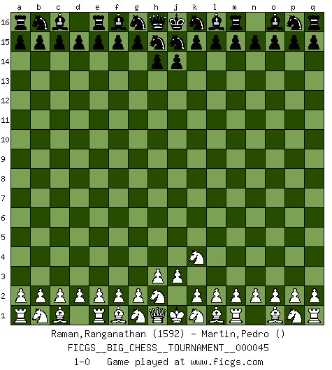 Last move : 1-0 2009 July 31 0:0:12 [Event "FICGS__BIG_CHESS__TOURNAMENT__000045"] [Site "FICGS"] [Date "2009.06.30"] [Round "1"] [White "Raman,Ranganathan"] [Black "Martin,Pedro"] [Result "1-0"] [WhiteElo "1592"] [BlackElo ""] 1.j2-k4 1-0 This big chess game has been lost on time (started : 2009.06.30 18:39:50) Follow this game move after move (download)With or without the title, Bobby Fischer was unquestionably the greatest player of his time. (Burt Hochberg) Im Schach gewinnt jeder. Hat man Freunde am Spiel - und das ist die Hauptsache - ist auch der Verlust einer Partie kein Unglück. (David Bronstein) En manos de Fischer's, una diminuta ventaja teórica es tan buena como tener una Reina de ventaja. (Isaac Kashdan) La guerre est enfant de la passion, la passion est enfant du narcissisme et le narcissisme est l'enfant. (...) Une autre partie ? (Thibault de Vassal) Lamb in skin of tiger, still fears the wolf. (Chinese proverb)