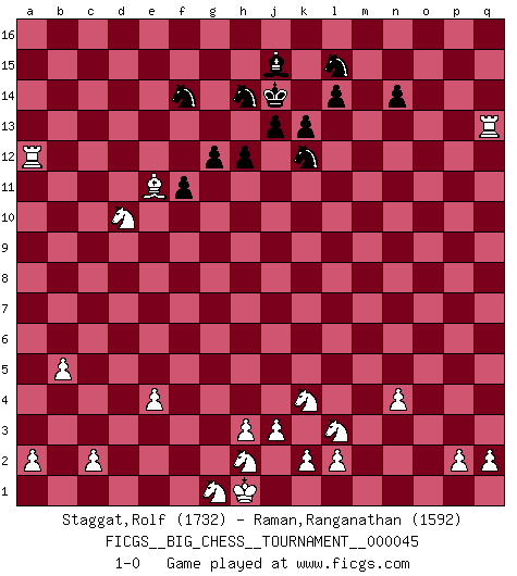 Last move : 1-0 2009 December 5 21:10:29 [Event "FICGS__BIG_CHESS__TOURNAMENT__000045"] [Site "FICGS"] [Date "2009.06.30"] [Round "1"] [White "Staggat,Rolf"] [Black "Raman,Ranganathan"] [Result "1-0"] [WhiteElo "1732"] [BlackElo "1592"] 1.j2-k4 j15-k13 2.h1-o7 h15-g13 3.o7-o15 p16-o14 4.o15-c4 b16-c14 5.d2-d4 h16-o10 6.c1-e3 o10-o2 7.k1-l3 d15-d13 8.p1-o3 o2-b14 9.c4-b3 c14-b12 10.n2-n4 a15-a13 11.m2-m4 m15-m13 12.b1-c3 m16-m14 13.g2-g3 l16-n14 14.f1-g2 m13-m12 15.o1-g8 n14-m13 16.g2-d5 n15-n14 17.l1-o4 l15-l14 18.e3-k8 e15-e13 19.k8-e13 f15-f14 20.e13-c15 b14-c13 21.b3-b9 f14-f13 22.a1-d1 m14-m15 23.b9-m9 e16-e12 24.q1-o1 h14-h13 25.m9-g4 g13-e14 26.c15-m6 g15-g13 27.d1-d3 e12-g12 28.g4-l8 f13-f12 29.g8-j10 e14-d16 30.j10-g12 c16-g12 31.l8-a8 k16-h15 32.d5-m13 o14-m13 33.d3-e3 d16-e14 34.m6-l5 c13-e15 35.c3-d5 f16-j13 36.e1-d1 e15-f15 37.e3-c3 g12-f13 38.a8-c8 b12-c14 39.d1-d3 a16-c16 40.l5-b14 d13-d12 41.c8-a10 o16-l13 42.d3-e3 q16-o16 43.o3-m2 m15-o15 44.o4-l7 j13-q6 45.o1-o15 o16-o15 46.j1-j2 m12-m11 47.m1-o1 m13-o14 48.a10-b11 q6-m2 49.b11-m11 o15-m15 50.m11-l10 l13-j15 51.l7-k6 f13-d11 52.o1-m1 m15-m4 53.k6-m4 m2-o4 54.l10-a10 c16-a16 55.a10-e14 f15-e14 56.e3-e14 a16-a14 57.b14-d12 o4-j9 58.m4-j7 j9-d4 59.m1-m16 h15-k16 60.c3-d3 d4-f2 61.j2-h1 f2-g3 62.d3-g3 c14-d12 63.e14-a14 d11-a14 64.j7-d12 o14-m15 65.g3-g7 g13-g12 66.g7-m7 m15-k14 67.m16-n16 k13-l15 68.n16-n15 k14-m13 69.n15-p15 q15-q13 70.p15-q15 a14-g8 71.e2-e4 l15-k13 72.q15-q13 f12-f11 73.m7-m8 b15-b13 74.m8-g8 k13-h14 75.d12-b14 a13-a12 76.g8-b8 m13-l15 77.b8-b13 k15-k13 78.b14-e11 j16-k15 79.b13-a13 h13-h12 80.a13-a12 j14-j13 81.b2-b4 k16-j14 82.b4-b5 j14-k12 83.d5-e7 k15-j14 84.e7-f9 g16-f14 85.f9-d10 1-0 This big chess game has been lost on time (started : 2009.06.30 18:39:50) Follow this game move after move (download)Bobby Fischer is the greatest Chess player who has ever lived. (Ken Smith) Ich würde mich als ganz normalen Jungen bezeichnen [Im Alter von 12]. (Sergej Karjakin) Alguna parte de un error es siempre correcto. (Savielly Tartakover) Les Echecs ont trois composantes : le temps, l'espace et le matériel en dernier. (Mikhail Tal) There are two kinds of people in the world, my friend. Those who have a loaded gun and those who dig. You dig ! (Blondie in The Good, The Bad and The Ugly)