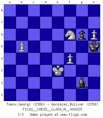 Last move : 1-0 2010 September 3 17:55:19 [Event "FICGS__CHESS__CLASS_M__000029"] [Site "FICGS"] [Date "2009.07.01"] [Round "1"] [White "Tomov,Georgi"] [Black "Gonzalez,Bolivar"] [Result "1-0"] [WhiteElo "2386"] [BlackElo "2258"] 1.Nf3 Nf6 2.c4 c5 3.Nc3 Nc6 4.d4 cxd4 5.Nxd4 Qb6 6.Nb3 e6 7.Bg5 Be7 8.e3 O-O 9.Be2 d5 10.cxd5 Rd8 11.Bf3 Nxd5 12.Nxd5 exd5 13.Bxe7 Nxe7 14.Qd4 Nc6 15.Qxb6 axb6 16.Ke2 Be6 17.Rhd1 Ne5 18.Nd4 Rdc8 19.a3 Rc5 20.Rd2 Kf8 21.Ke1 Nc4 22.Rc2 Nd6 23.Be2 Rac8 24.Bd3 Ke7 25.f3 Rxc2 26.Nxc2 Kf6 27.Rd1 Nc4 28.Bxc4 Rxc4 29.Nd4 Bd7 30.Kd2 Ke5 31.g4 Ra4 32.Ke2 Rc4 33.h4 Kd6 34.h5 b5 35.Rg1 Ra4 36.Nc2 Rc4 37.Kd2 Ke6 38.f4 Kd6 39.g5 Ke7 40.Nd4 Ra4 41.Kc3 Rc4+ 42.Kd3 Ra4 43.h6 g6 44.Rc1 Kd6 45.Rc3 b4 46.axb4 Rxb4 47.Rb3 Rxb3+ 48.Nxb3 Ke7 49.Nd2 Bf5+ 50.Kd4 Kd6 51.Nf3 b6 52.Ne5 Ke6 53.b4 Bh3 54.b5 Bf5 55.e4 dxe4 56.Nc4 e3 57.Nxe3 Bh3 58.Nd5 Bg4 59.Nxb6 Bf3 60.Ke3 Bg2 61.Na4 f6 62.Nc5+ Kf5 63.gxf6 Kxf6 64.Ne4+ Kf5 65.Ng5 Kg4 66.Nxh7 Kh5 67.Nf6+ 1-0 This chess game has been lost on time (started : 2009.07.01 7:57:42) Reti Opening Kingside Castling by player Black (move 8) 10 pieces endgame at move 63 : White KNPPPP , Black KBPP WHITE : King + 1 Knight 4 Pawns BLACK : King + 1 Bishop 2 Pawns 9 pieces endgame at move 63 : White KNPPP , Black KBPP WHITE : King + 1 Knight 3 Pawns BLACK : King + 1 Bishop 2 Pawns 8 pieces endgame at move 66 : White KNPPP , Black KBP WHITE : King + 1 Knight 3 Pawns BLACK : King + 1 Bishop 1 Pawn Player White won this chess game. Follow this game move after move (download)It's always better to sacrifice your opponent's men. (Savielly Tartakover) Wer wird heute Abend ihr Gegner sein? -- Heute Abend spiele ich gegen die schwarzen Steine. (Akiba Rubinstein) Tu puedes aprender mucho mas de una partida que pierdas que de una partida ganada. Tendras que perder cientos de partidas antes de llegar a ser un buen jugador. (Jose Raul Capablanca) Il n'y a plus de joueurs du niveau de Jacob Murray dont la seule quête est le beau jeu, le plaisir de voir les pièces construire quelque chose. Sur 10 idées à la minute, 9 seront sans intérêt, la dernière s'avèrera géniale. (Christian Bauer) Waiting for chance ? Play in casinos. (FICGS proverb)