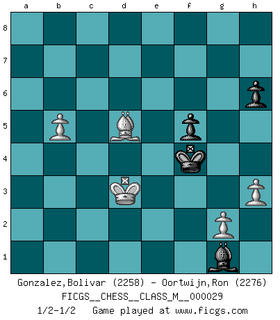 Last move : 1/2-1/2 2009 November 30 19:49:56 [Event "FICGS__CHESS__CLASS_M__000029"] [Site "FICGS"] [Date "2009.07.01"] [Round "1"] [White "Gonzalez,Bolivar"] [Black "Oortwijn,Ron"] [Result "1/2-1/2"] [WhiteElo "2258"] [BlackElo "2276"] 1.e4 c5 2.Nf3 Nc6 3.d4 cxd4 4.Nxd4 Nf6 5.Nc3 e5 6.Ndb5 d6 7.Bg5 a6 8.Na3 b5 9.Bxf6 gxf6 10.Nd5 f5 11.c3 Bg7 12.Bd3 Be6 13.Nxb5 axb5 14.Bxb5 Bd7 15.exf5 O-O 16.O-O Re8 17.Qg4 Rc8 18.Rfe1 Kh8 19.Re3 e4 20.a4 Ne7 21.Bxd7 Nxd5 22.Rg3 Be5 23.f6 Rg8 24.Qxg8+ Qxg8 25.Rxg8+ Rxg8 26.a5 Bxf6 27.a6 Ne7 28.Ra4 Ra8 29.b4 Nd5 30.Bc6 Nxc3 31.Bxa8 Nxa4 32.Bc6 Nb6 33.Bxe4 Kg7 34.b5 Bd4 35.a7 Kf6 36.Kf1 Ke5 37.Bc6 Na8 38.Bxa8 Bxa7 39.Ke2 h6 40.f3 d5 41.Kd3 Bg1 42.h3 f5 43.f4+ Kxf4 44.Bxd5 1/2-1/2 Sicilian : Pelikan (Lasker/Sveshnikov) variation Kingside Castling by player Black (move 15) Kingside Castling by player White (move 16) 10 pieces endgame at move 43 : White KBPPP , Black KBPPP WHITE : King + 1 Bishop 3 Pawns BLACK : King + 1 Bishop 3 Pawns 9 pieces endgame at move 44 : White KBPPP , Black KBPP WHITE : King + 1 Bishop 3 Pawns BLACK : King + 1 Bishop 2 Pawns This chess game ended in a draw. Follow this game move after move (download)You have to have the fighting spirit. You have to force moves and take chances. (Bobby Fischer) Der zweitbeste Zug ist oft der einzig richtige. (Savielly Grigorievitsch Tartakower) Dejen al perfeccionista jugar por correo. (Yasser Seirawan) Karpov est une pièce de musée. (Garry Kasparov) You lose, general Kenobi. (General Grievous in Star Wars ep.3)