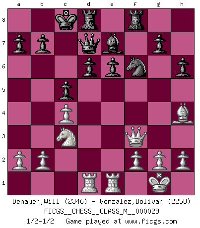 Last move : 1/2-1/2 2009 October 21 13:44:41 [Event "FICGS__CHESS__CLASS_M__000029"] [Site "FICGS"] [Date "2009.07.01"] [Round "1"] [White "Denayer,Will"] [Black "Gonzalez,Bolivar"] [Result "1/2-1/2"] [WhiteElo "2346"] [BlackElo "2258"] 1.e4 c5 2.Nf3 d6 3.Bb5+ Bd7 4.Bxd7+ Qxd7 5.O-O Nc6 6.c3 Nf6 7.d4 Nxe4 8.d5 Ne5 9.Re1 Nxf3+ 10.Qxf3 Nf6 11.c4 e5 12.dxe6 fxe6 13.Bg5 Be7 14.Nc3 h6 15.Bh4 O-O-O 16.Rad1 Rhf8 1/2-1/2 Sicilian : Canal-Sokolsky attack, Bronstein gambit Kingside Castling by player White (move 5) Queenside Castling by player Black (move 15) This chess game ended in a draw. Follow this game move after move (download)Chess is 99 percent tactics. (Teichmann) Nie in meinem Leben habe ich die französische Verteidigung gespielt, welche die Stumpfsinnigste von allen ist. (Wilhelm Steinitz) Realmente no sabemos como el juego fue inventado, aunque hay sospechas. Tan pronto como descubramos a los culpables, se los haremos saber. (Bruce Pandolfini) La vie est comme un jeu d'échecs : nous esquissons un plan, mais celui-ci est tributaire de ce que daignent faire l'adversaire aux échecs et le destin dans la vie. (Arthur Schopenhauer) Players are not good because they find tactics, it is about the way to find the positions in which those tactics are hidden. (Luc-Olivier Leclerc)